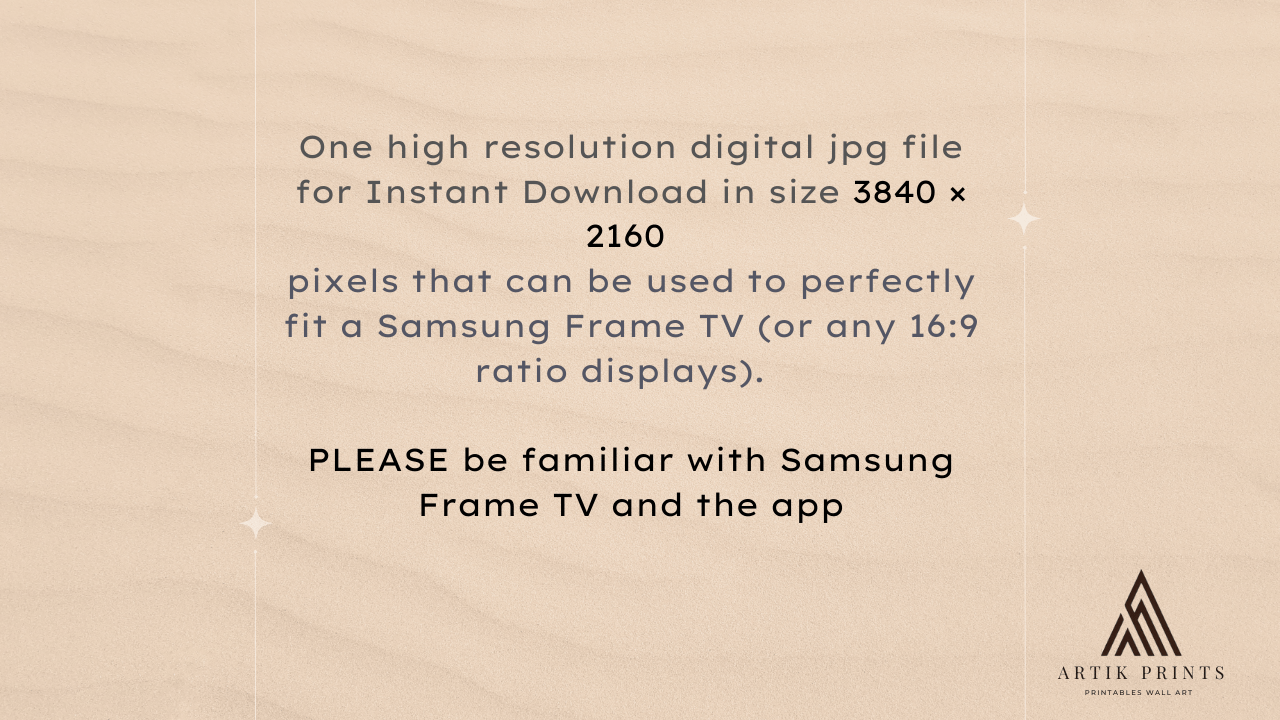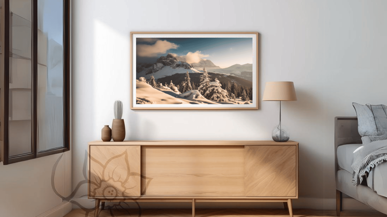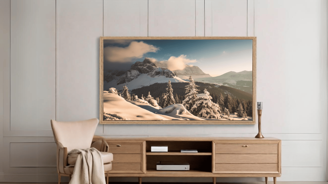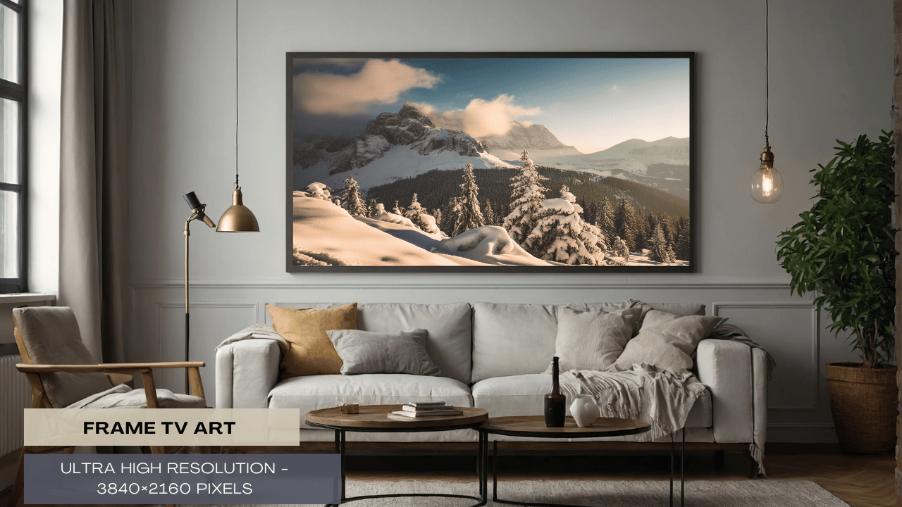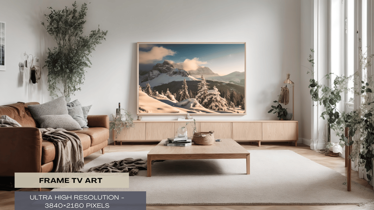 "Enter a timeless realm of peace and quiet with our TV art, Snowy Mountain Serenity." This old-style artwork, painstakingly created by our AI technology, takes you to a peaceful, snowy setting encircled by towering mountains. Immerse yourself in the beauty of nature every time you peek at your TV screen. Perfect for adding a dash of adventure and wonder to your home design. With this alluring piece of art, you can turn your living area into a peaceful retreat."