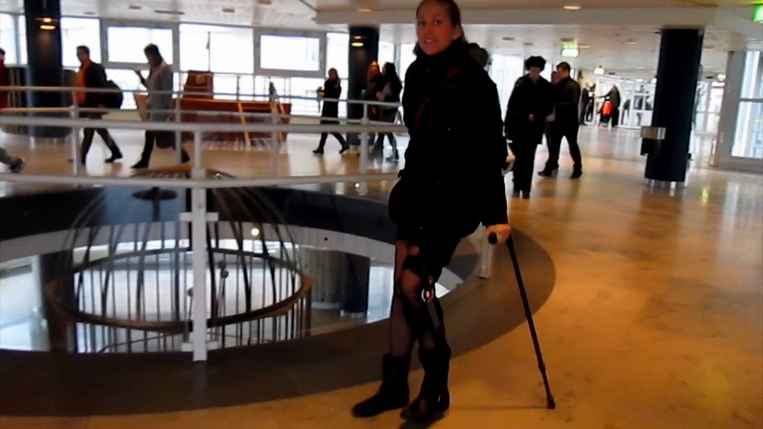 Rose has hurt her left knee and is using a kneebrace when she is on her way to the ferry over to Denmark.She is not allowed to put weight on her leg so she must use crutches all the time and we going to see her crutch down for stairs and around on the streets in this clip