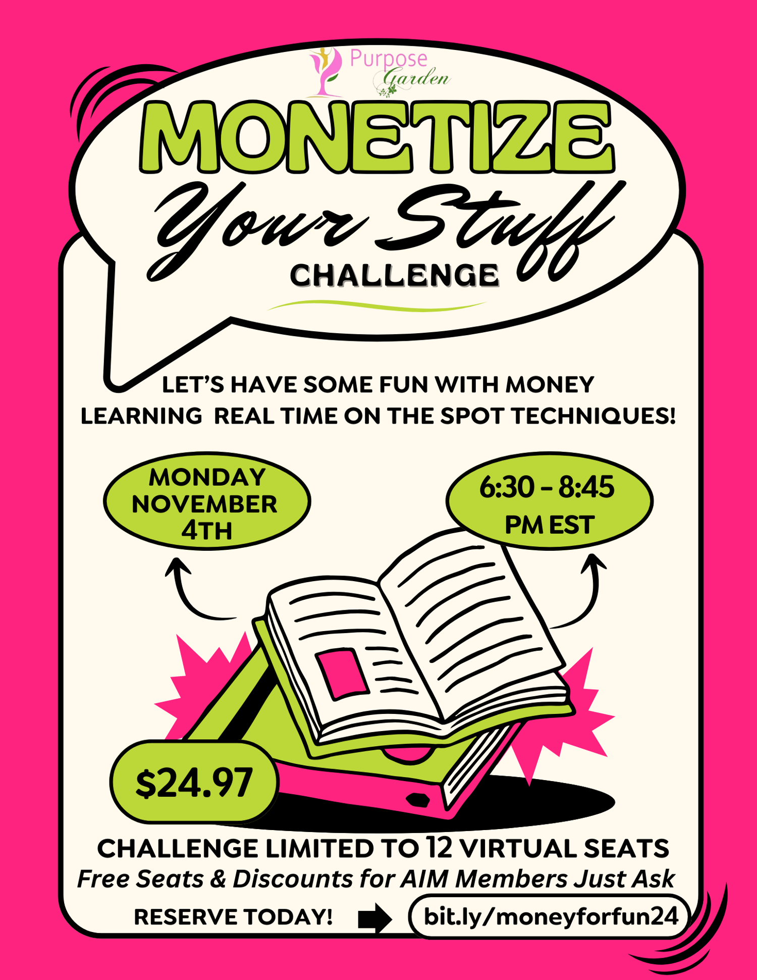 In this challenge, you will learn how to transform your books, skills, expertise, products, or services into profitable revenue. We will dive into the basics of focusing on your knowledge, utilizing what's readily available and identifying lucrative opportunities.