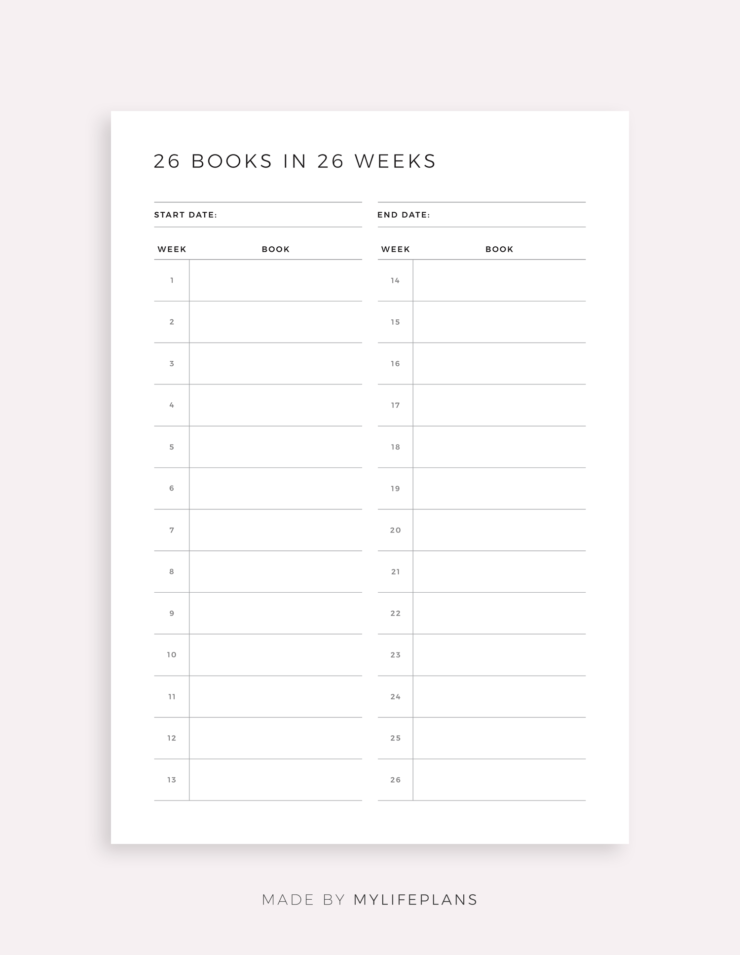This is a printable 26 books in 26 weeks challenge — just download, print, and start using it right away.