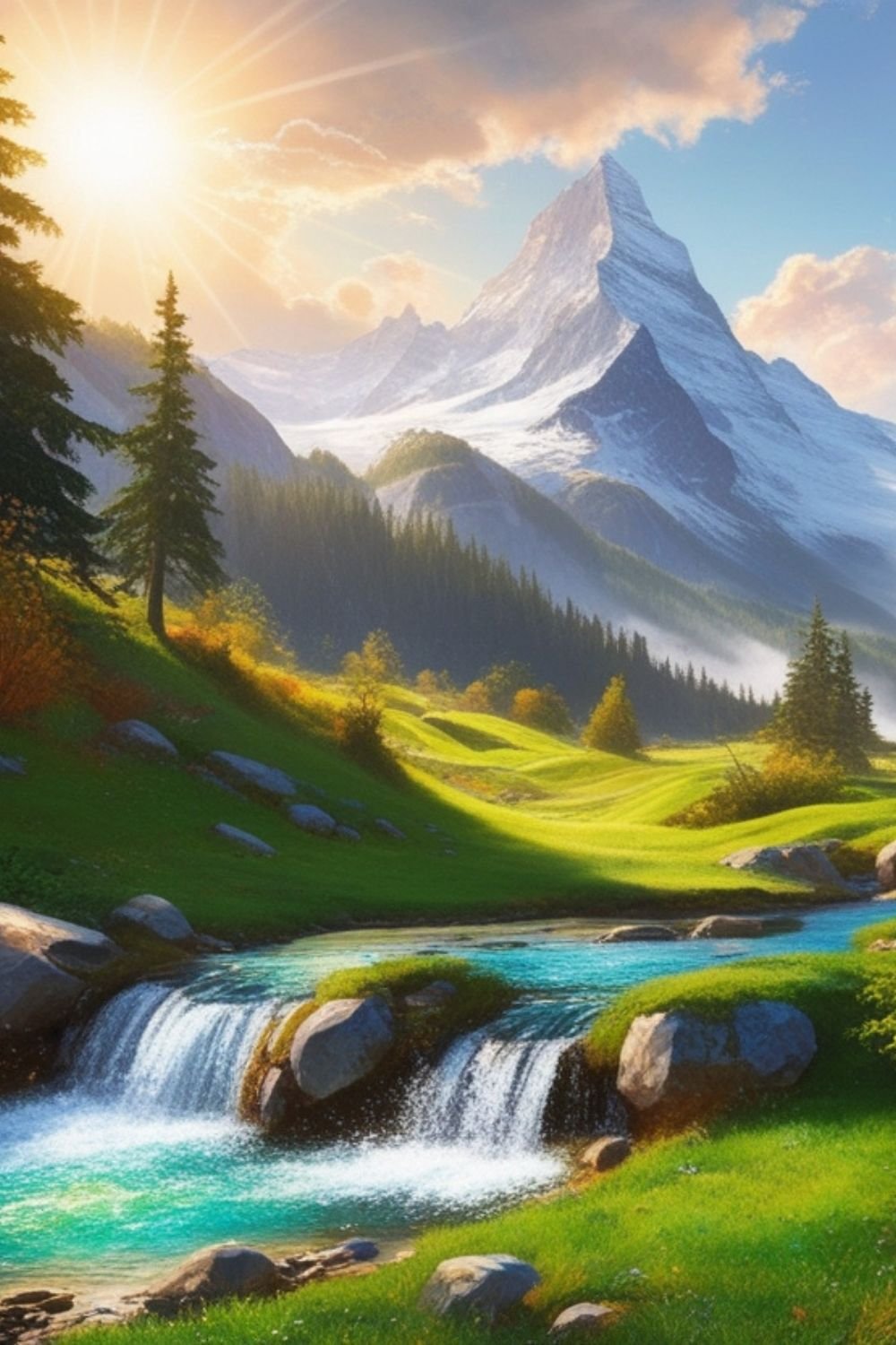 Immerse yourself in the awe-inspiring beauty of "Majestic Cascade Valley," a captivating artwork that brings the harmony of nature and fantasy to life. This stunning piece showcases towering, snow-capped mountains glowing under a bright, partly cloudy sky. In the foreground, a sparkling stream gracefully cascades through rocky terrain and lush green meadows, surrounded by evergreen trees and vibrant foliage.