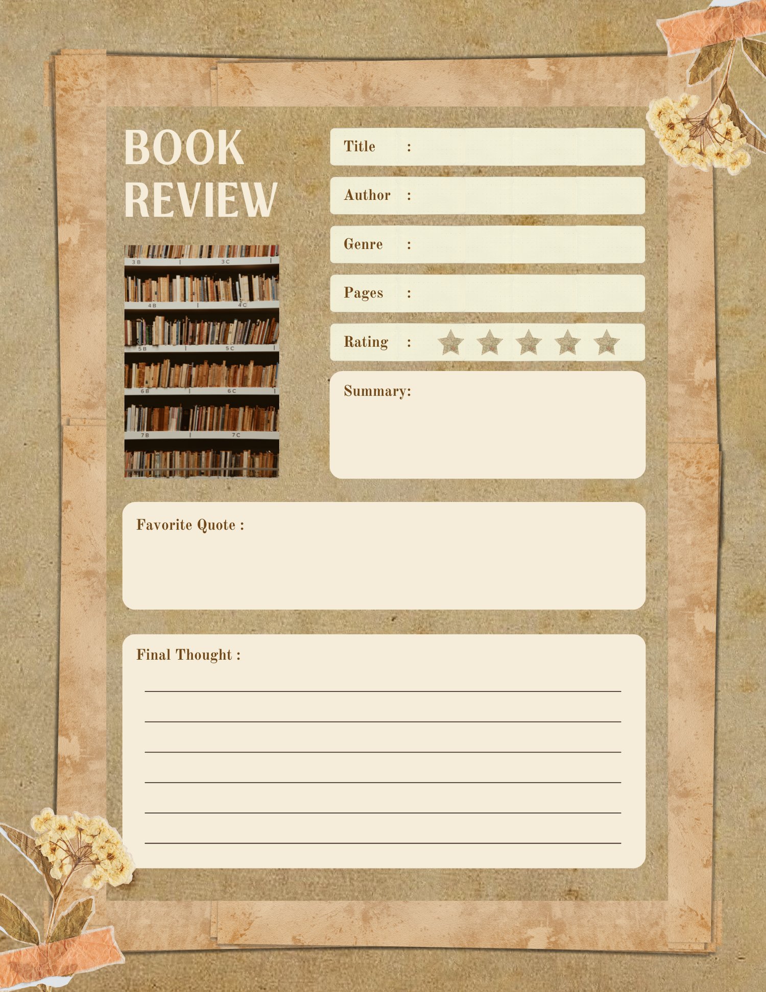 A cozy space for your reading journey — log titles, authors, ratings, and thoughts while building a personal library of memories and reviews.