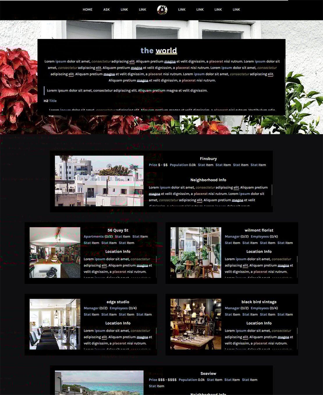 - Large neighborhood sections that include a 350x200 image, location name, stats and scrolling info box