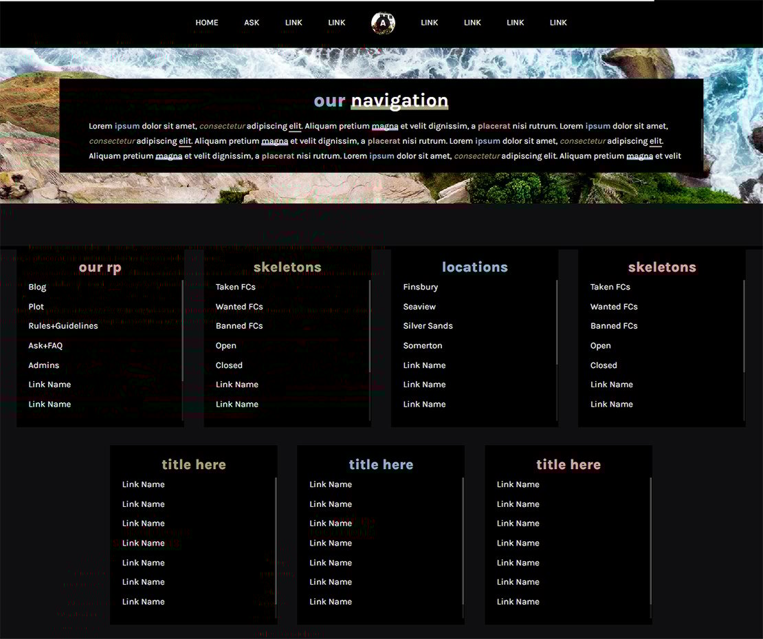 - A “landing page” design that includes a plot section, navigation, info deco toggle switches, guidelines section, weather widget, updates sections, admins section and about section