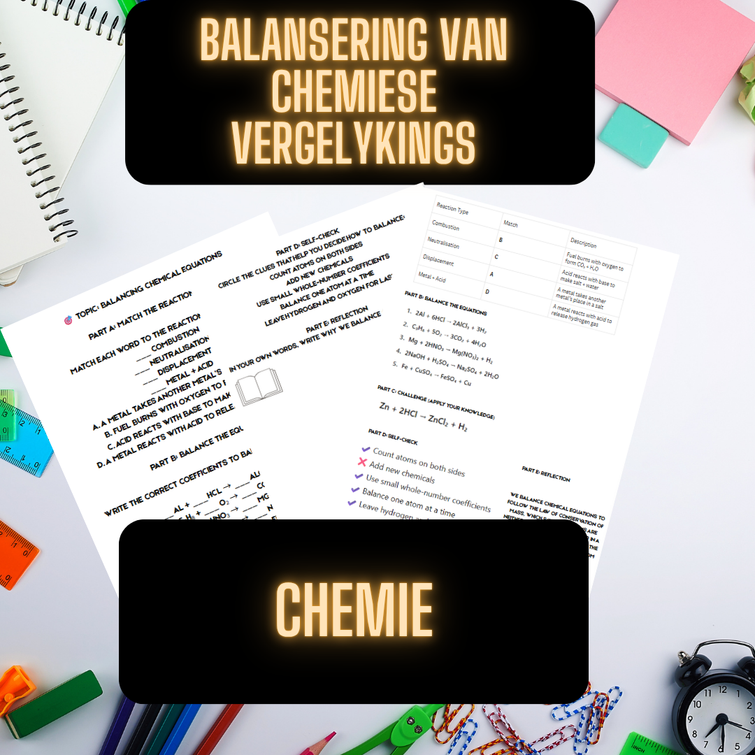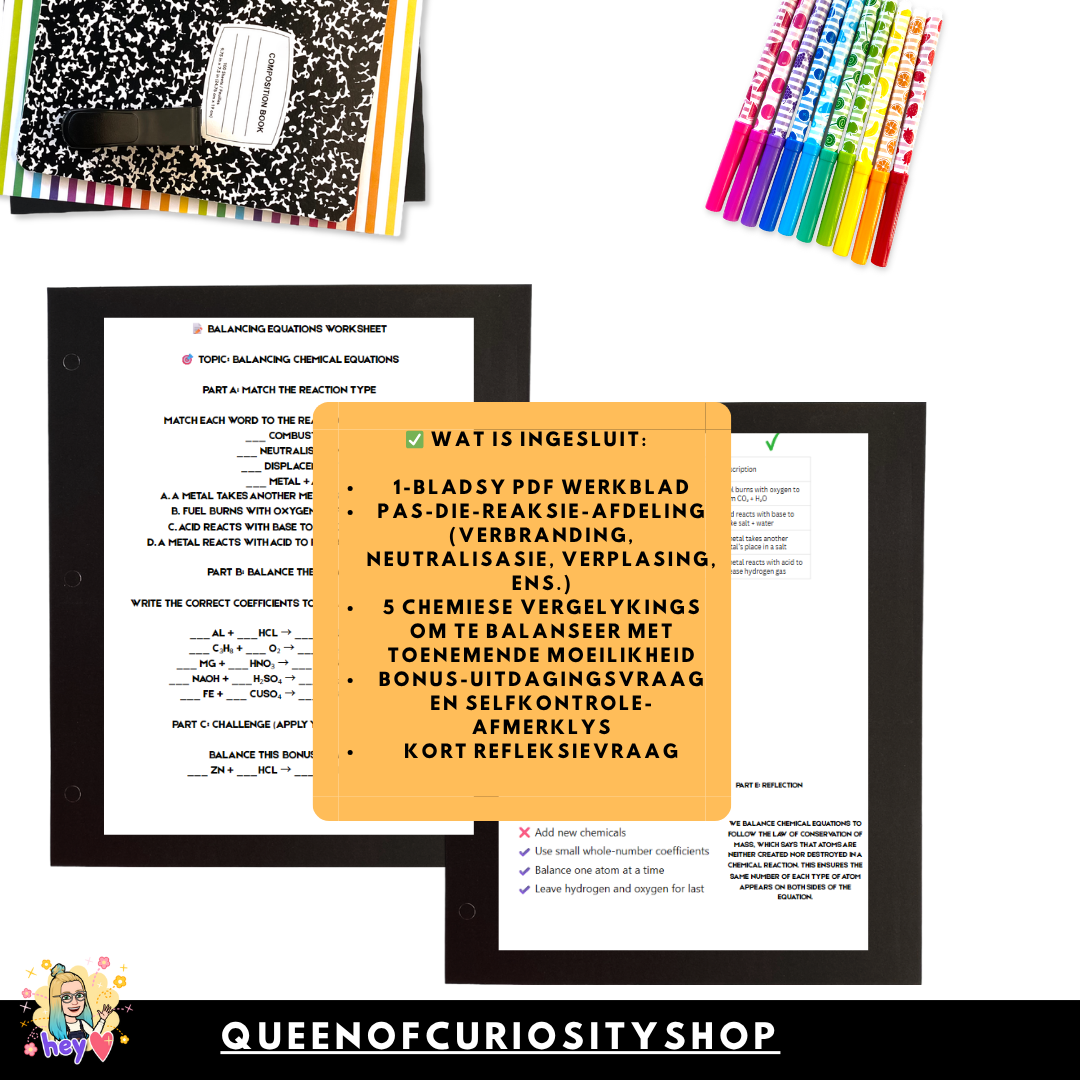 Hierdie eenbladsy, drukbare werkblad help leerders om hul vaardighede in die balansering van chemiese vergelykings te oefen en te versterk. Dit is ideaal vir die bekendstelling, hersiening of assessering van belangrike reaksietipes — insluitend sintese, verbranding, verplasing, neutralisasie en metaal-suur reaksies.