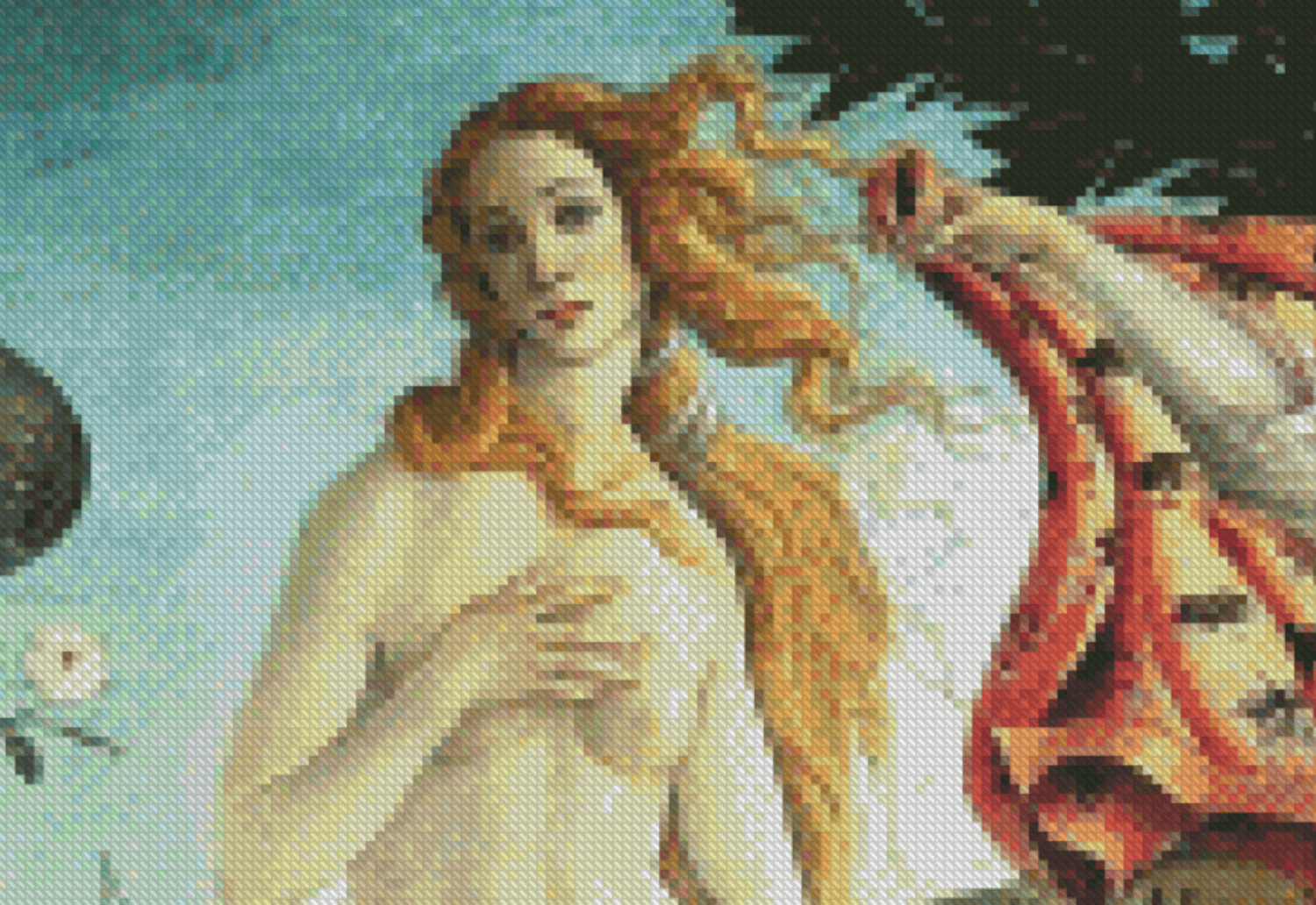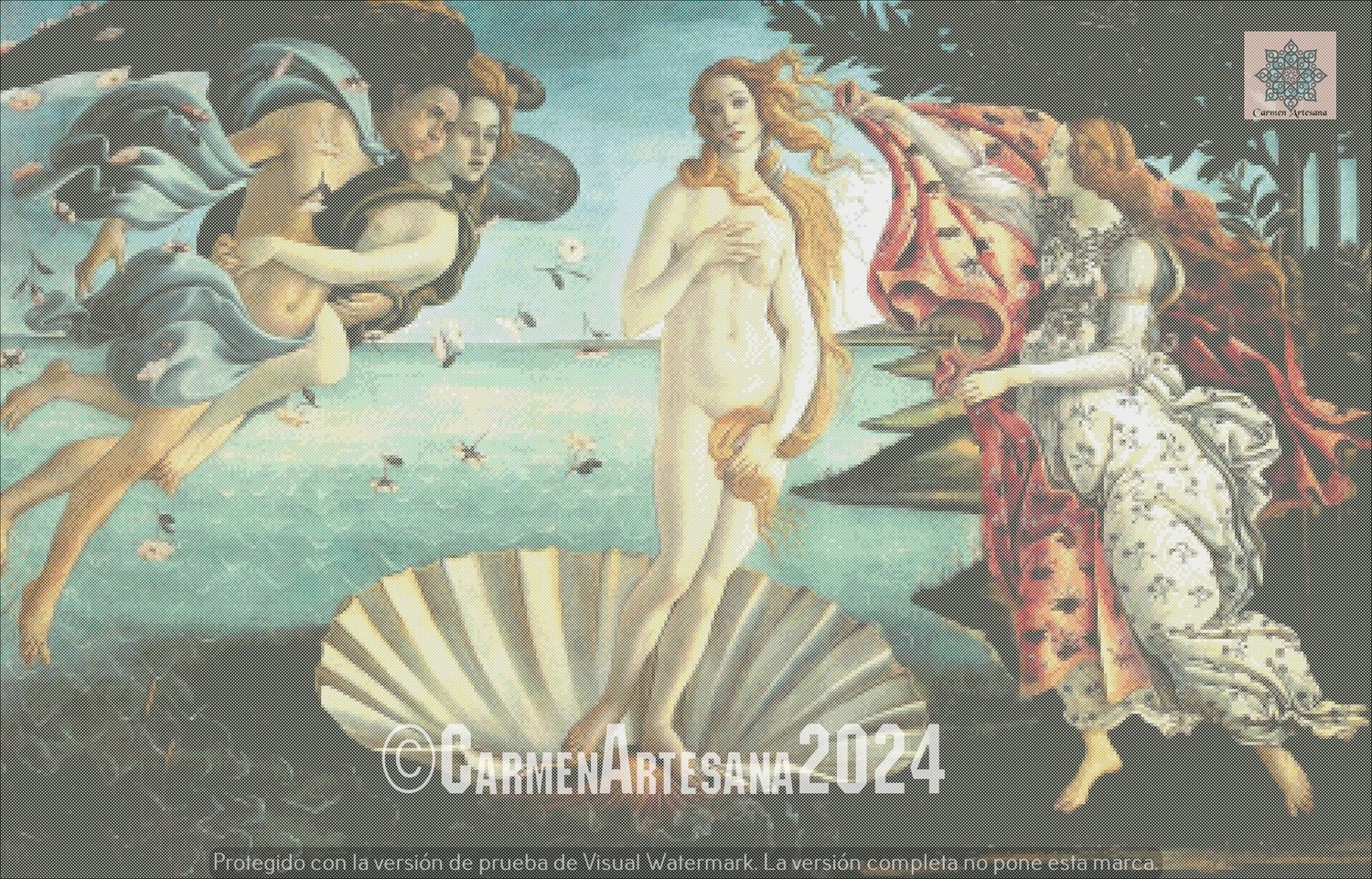 Birth of Venus (Botticelli), PDF cross stitch pattern, English/Español