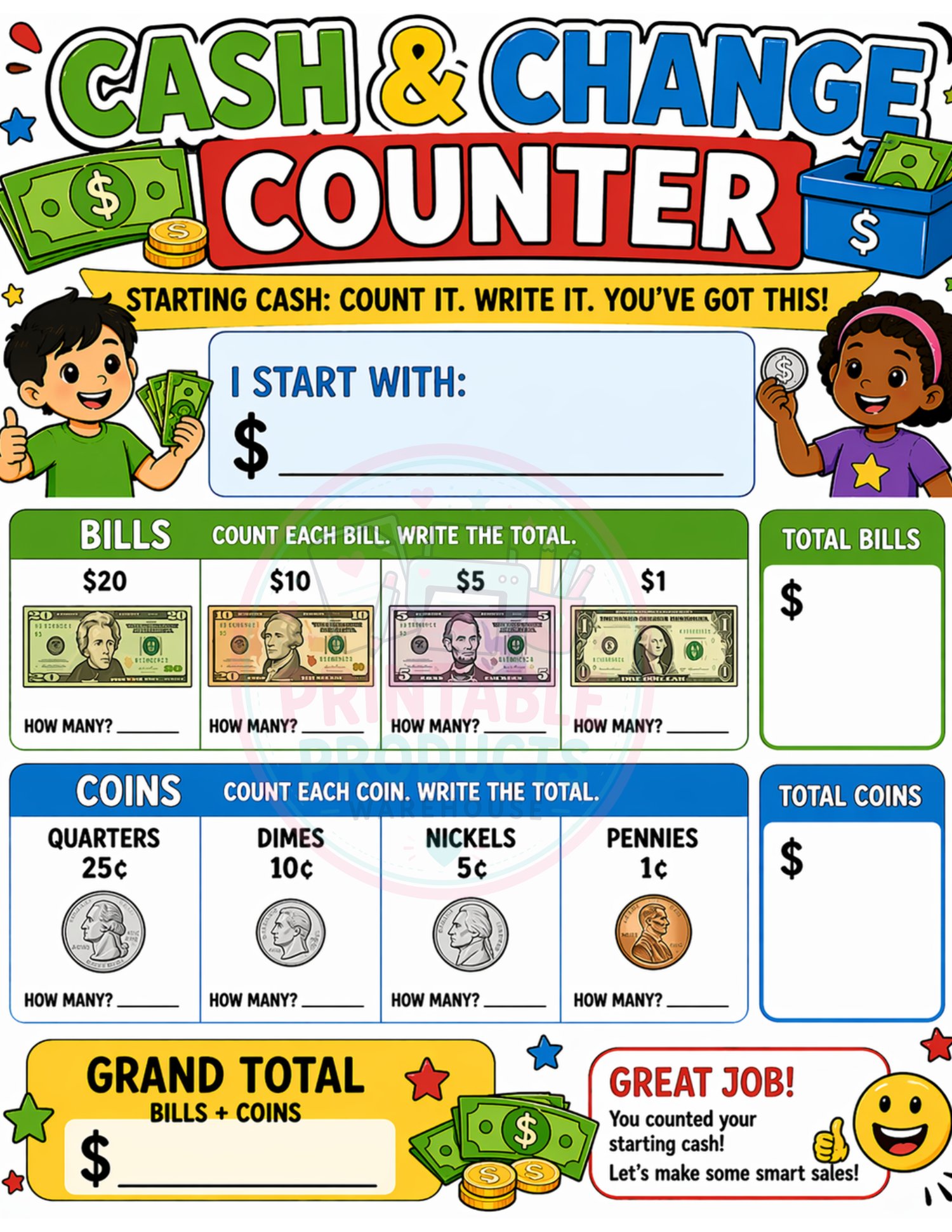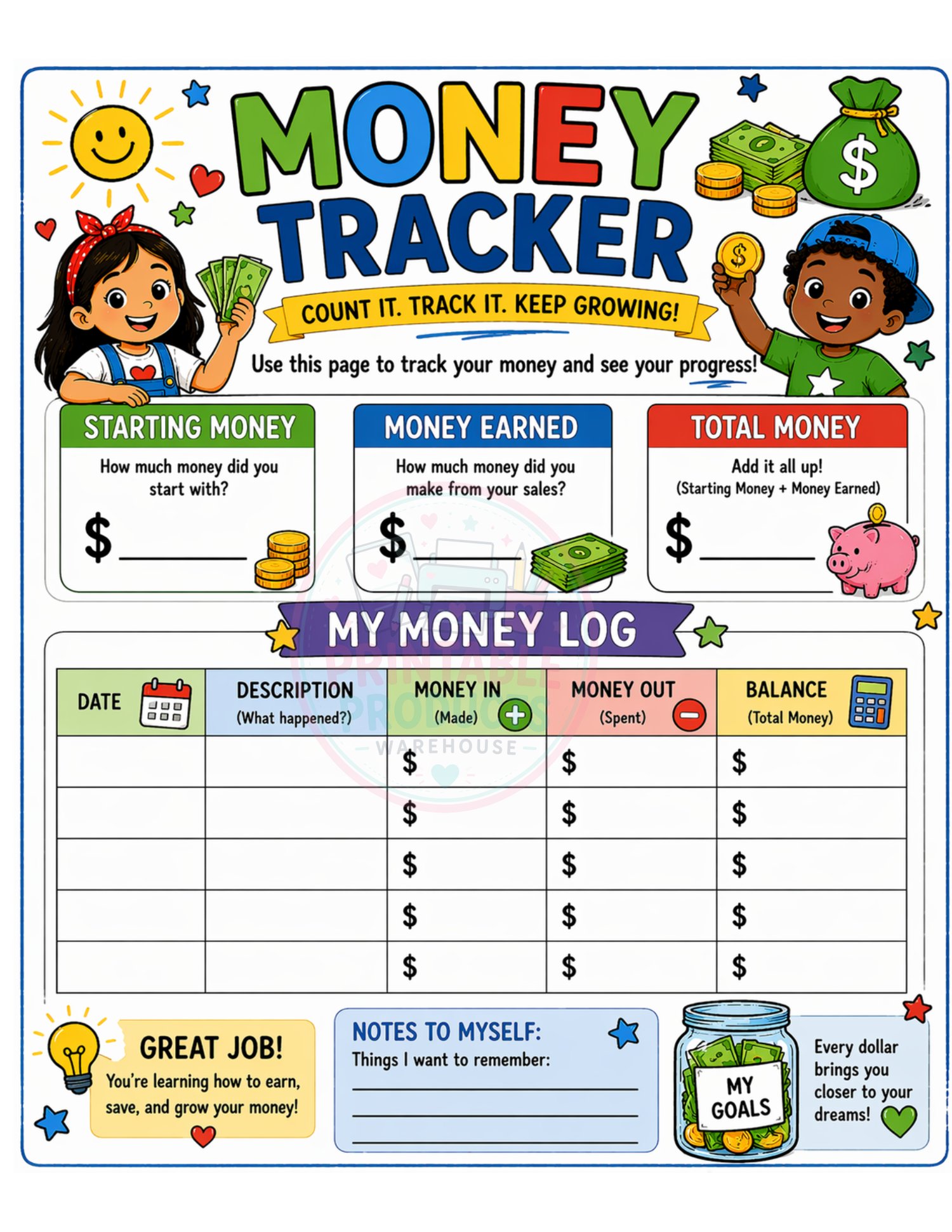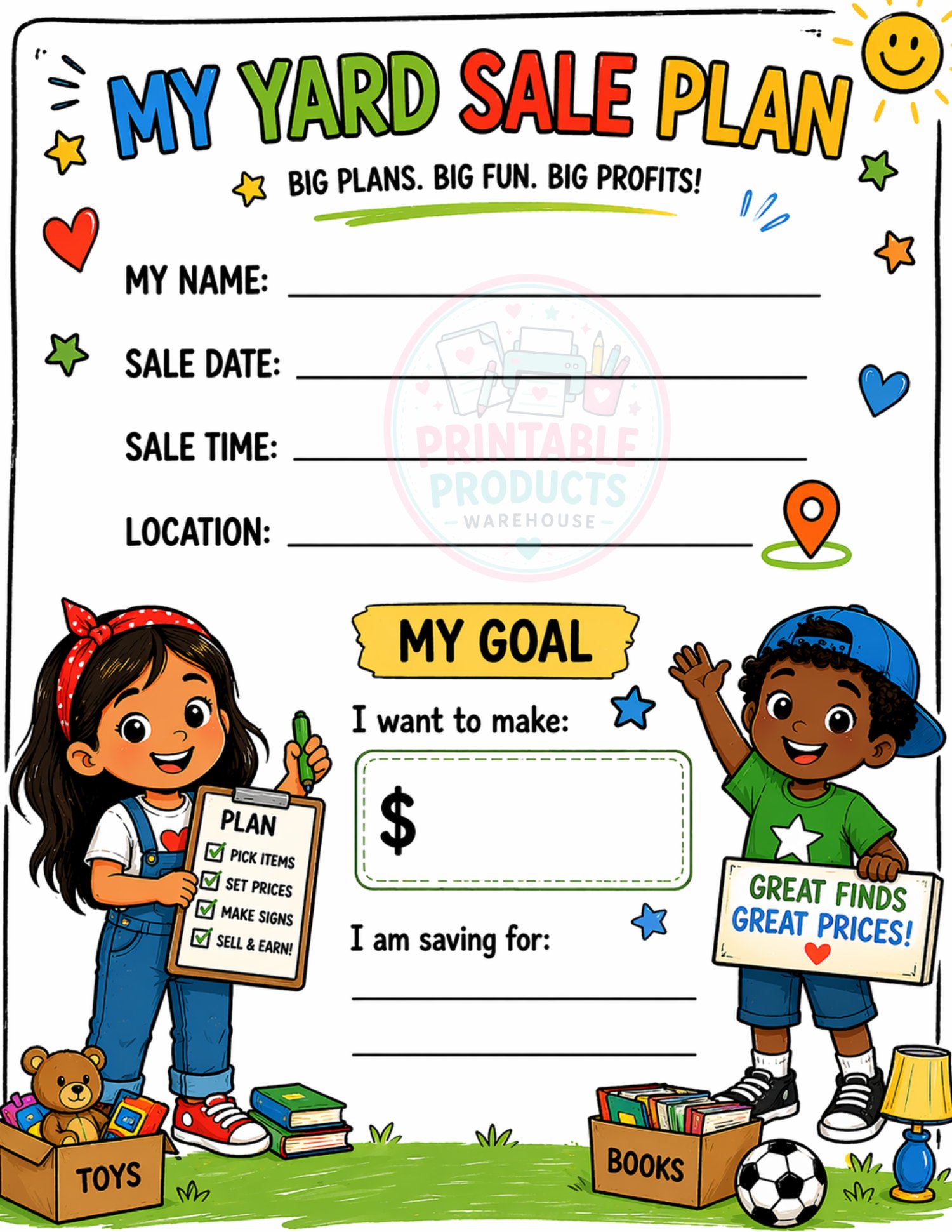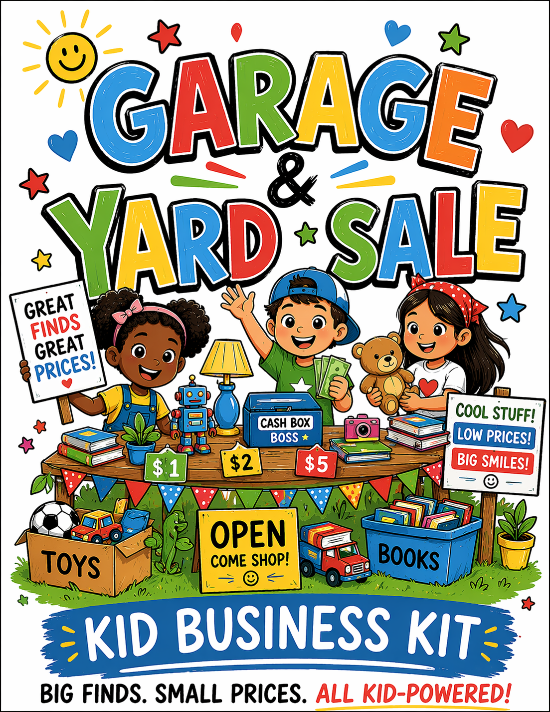 Whether itβs a weekend yard sale, garage sale, or neighborhood pop-up, this 21-page kit walks kids step-by-step through planning, organizing, pricing, selling, and tracking their earnings β all while building confidence and responsibility.