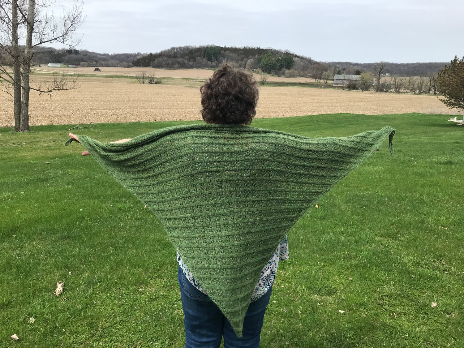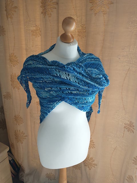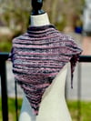 The shawl is a triangle shape constructed bottom-up, using a fagoted garter tab cast-on, and includes a 3-st fagoted lace edge on each side.