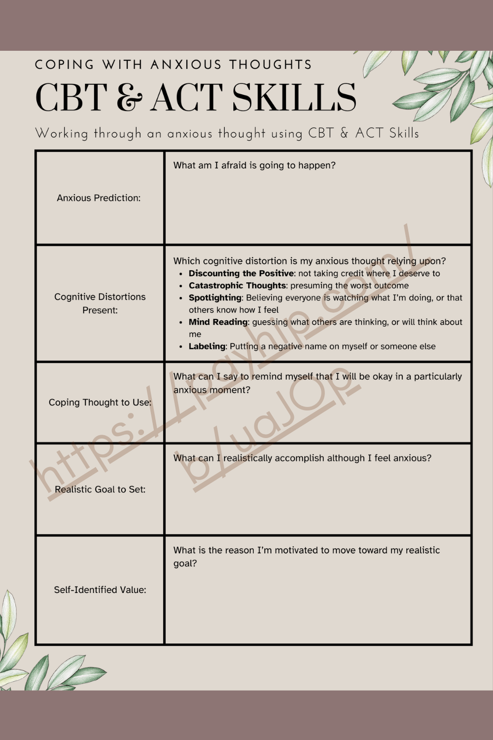 Practice thought challenging, and inserting coping thought statements as you identify anxious predictions, and the cognitive distortions and values associated with them. Utilize helpful CBT practices like thought challenging, and ACT skills around value identification. Overcome anxious predictions, and anxious thoughts using a guided exercise.