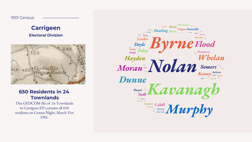 - There were 650 people resident in the Carrigeen Electoral Division on Census Night March 31st 1901. The 24 townlands included in this file, with their populations, are as follows:
