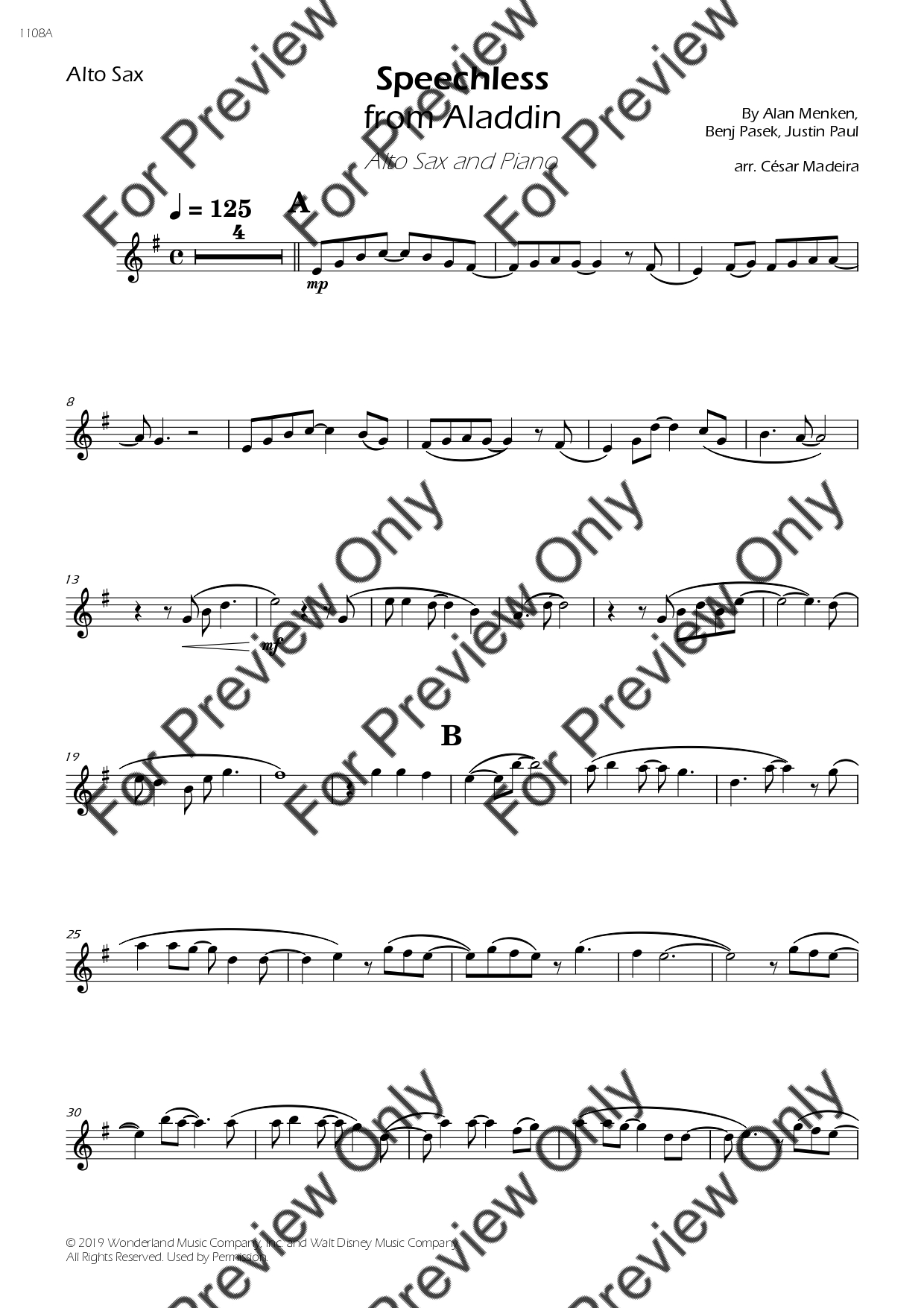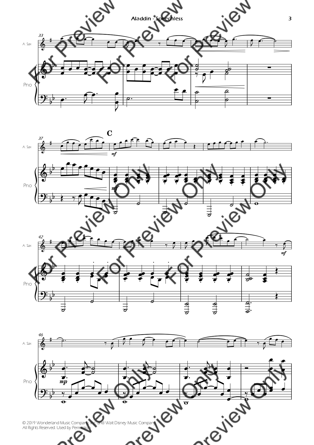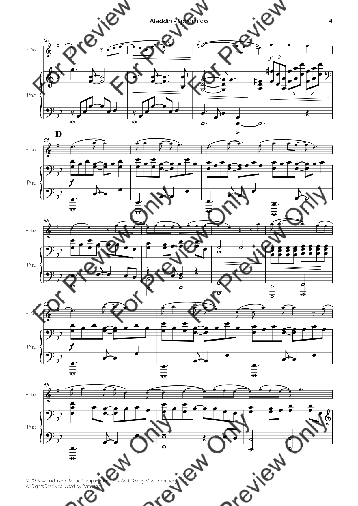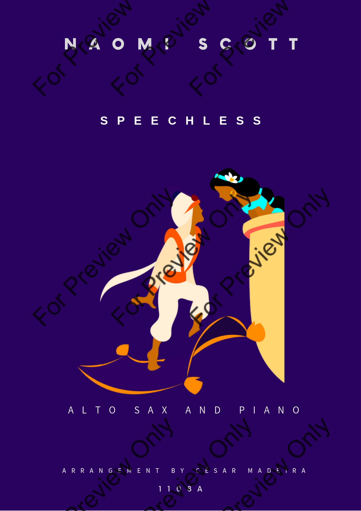 Speechless from Aladdin by Alan Menken. Arrangement for Alto Saxophone and Piano. With Full Score and Individual Parts. Have fun!