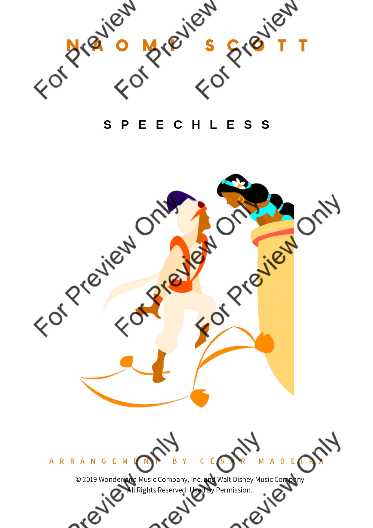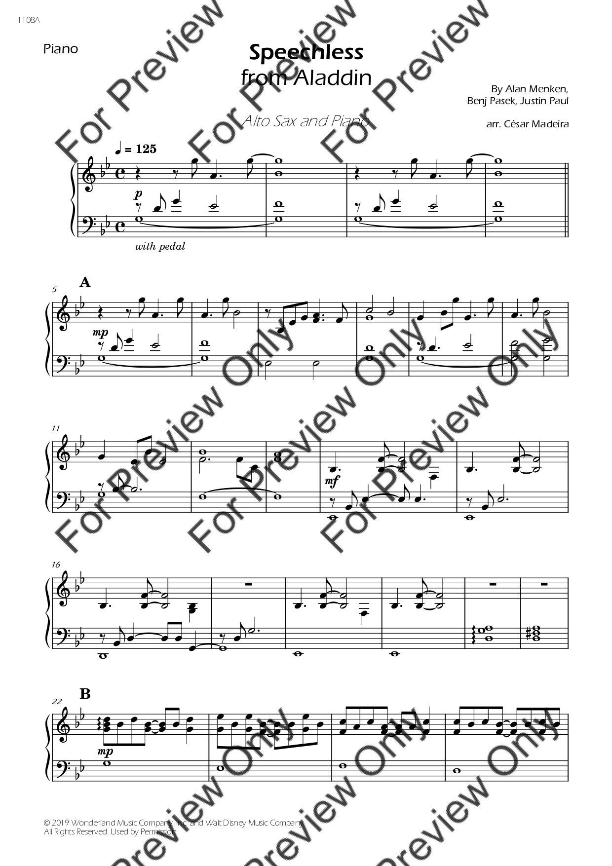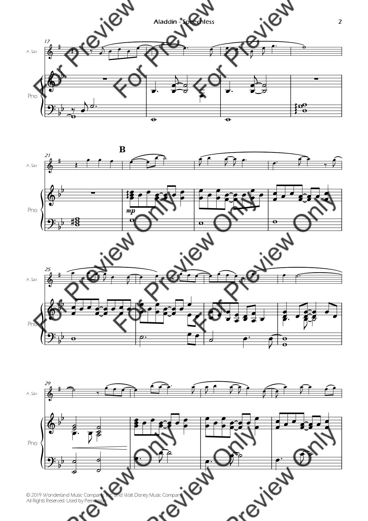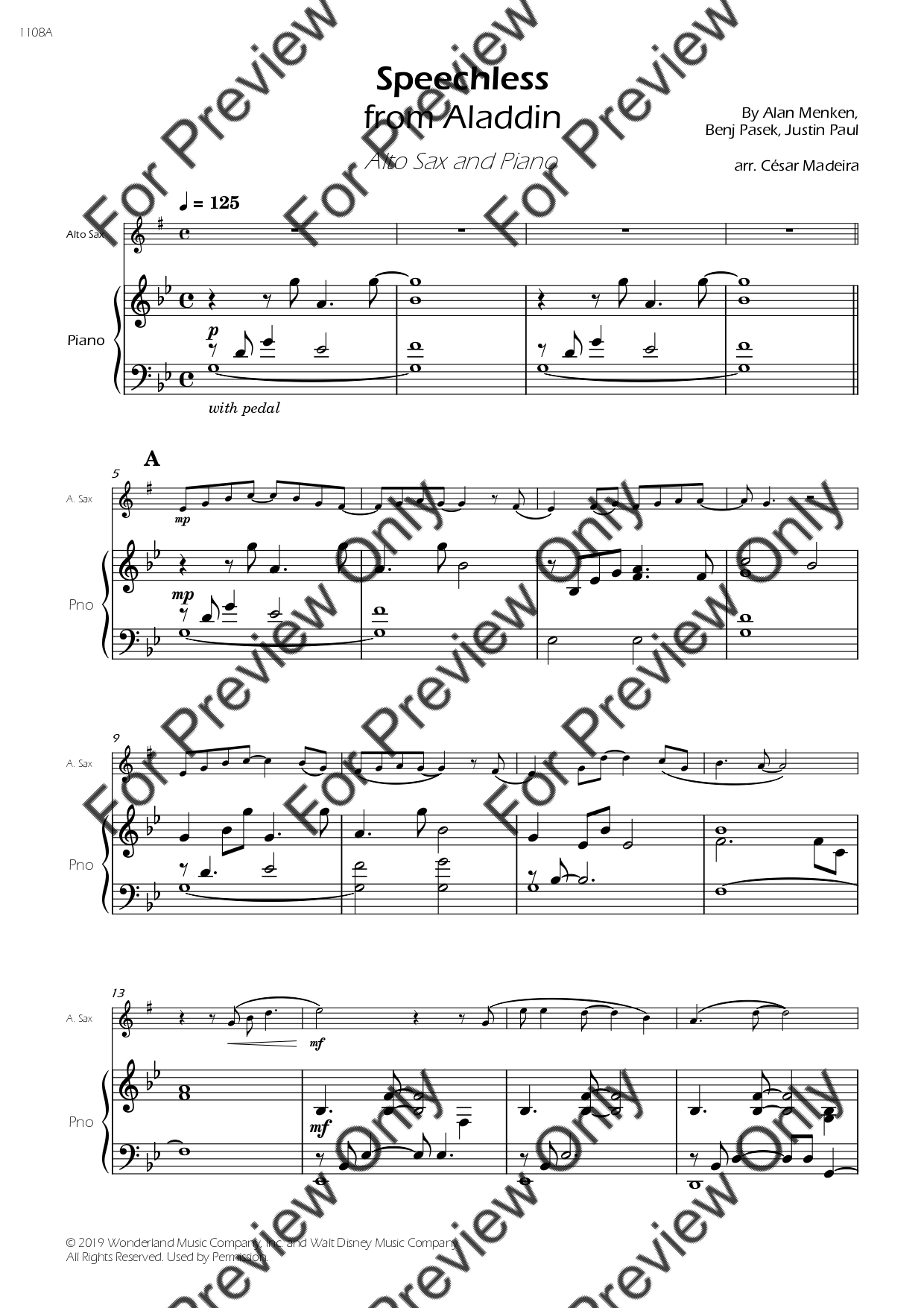 Speechless from Aladdin by Alan Menken. Arrangement for Alto Saxophone and Piano. With Full Score and Individual Parts. Have fun!