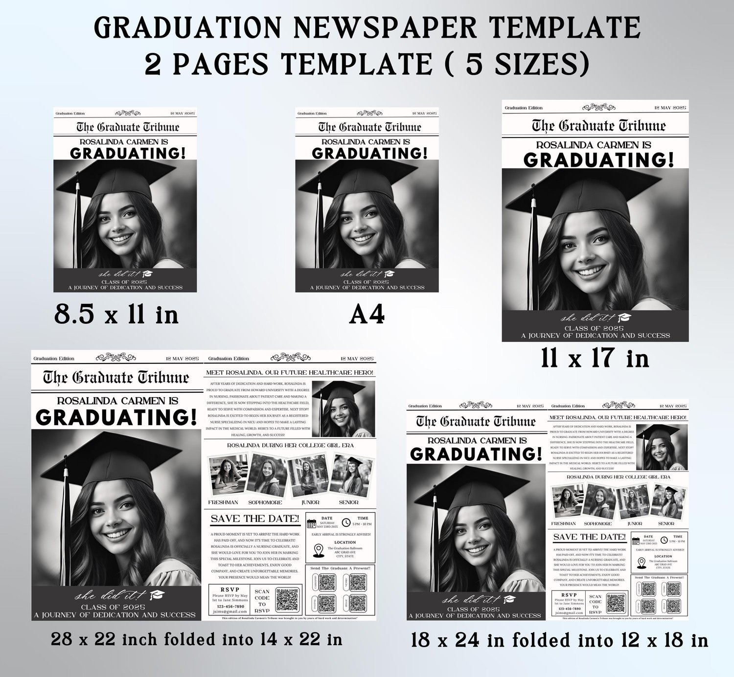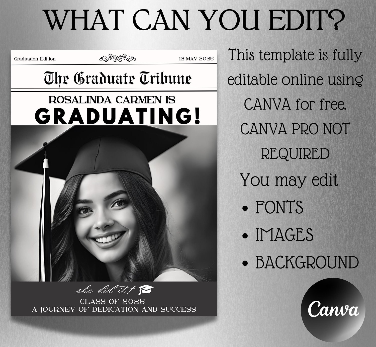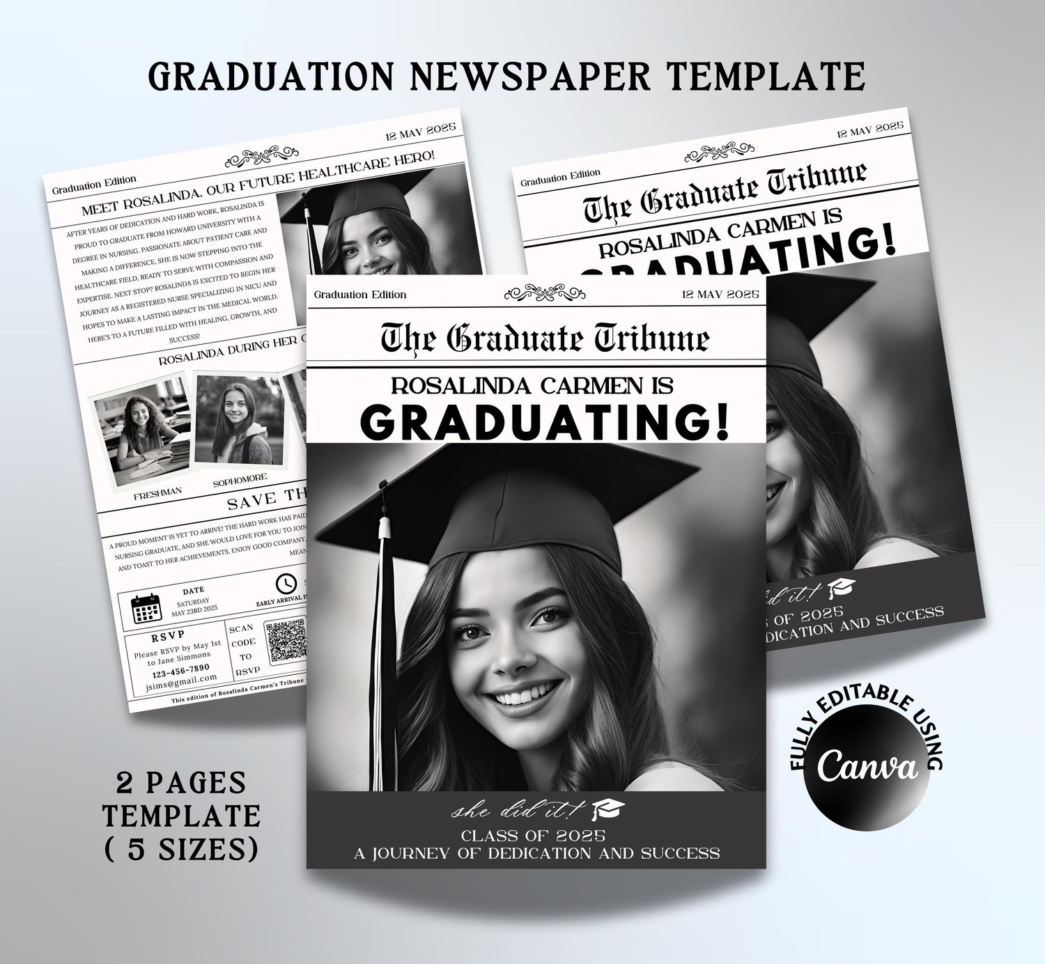 Graduation Newspaper Invitation Announcement Template, Editable Large Newspaper Invite, Save The Date, Class of 2025 Grad Ceremony, Canva
