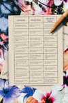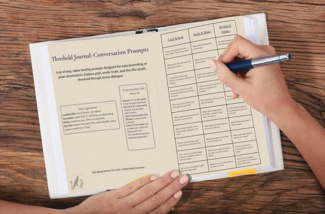 A printable set of taboo-busting prompts for solo journaling or group conversation. Explore where grief, desire, and mortality meet in the body. Use these pages to spark honest talk, ritual circles, or private writing. Straightforward safety agreements and an easy “Conversation Café” flow are included so you can host with confidence.