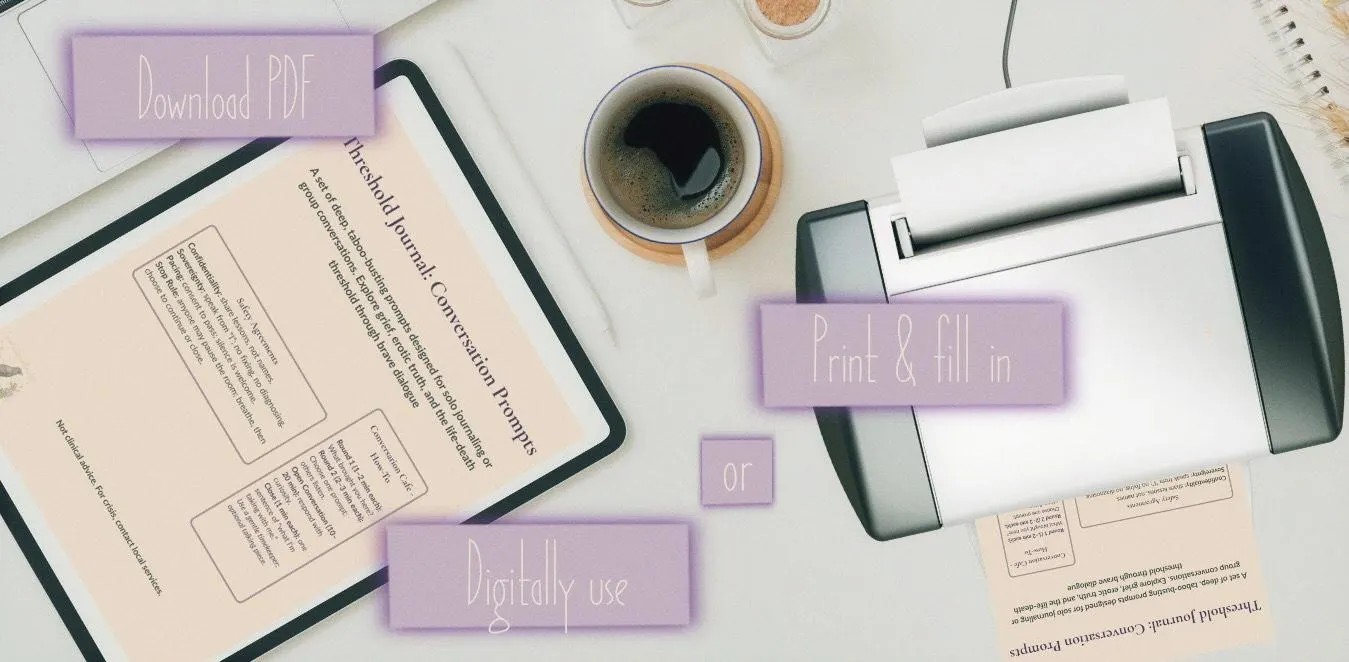 Threshold Journal Prompts | Printable Grief–Desire–Mortality Conversations | Solo & Group Ritual Dialogue PDF