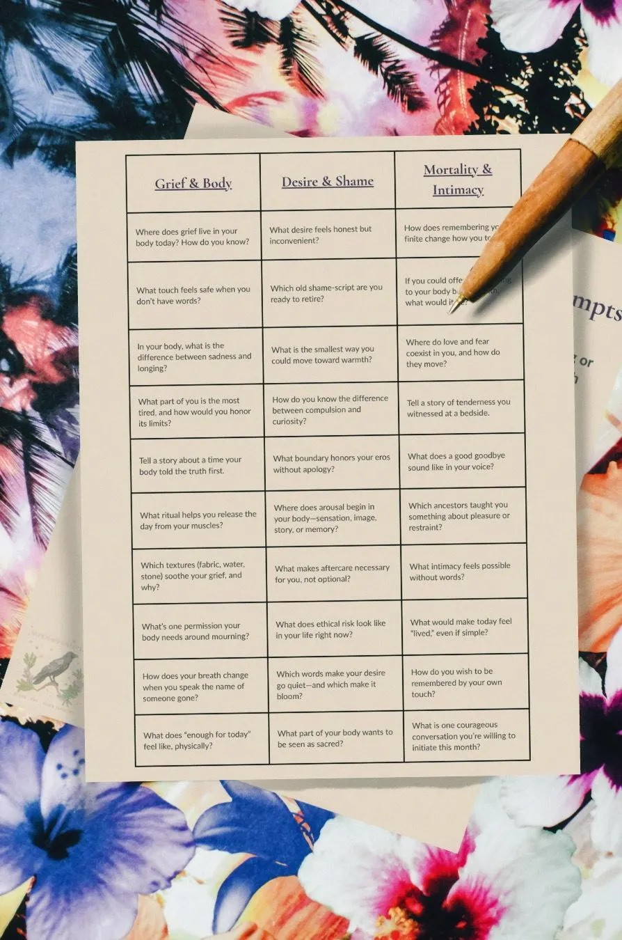 Dozens of prompts across Grief & Body, Desire & Shame, and Mortality & Intimacy.