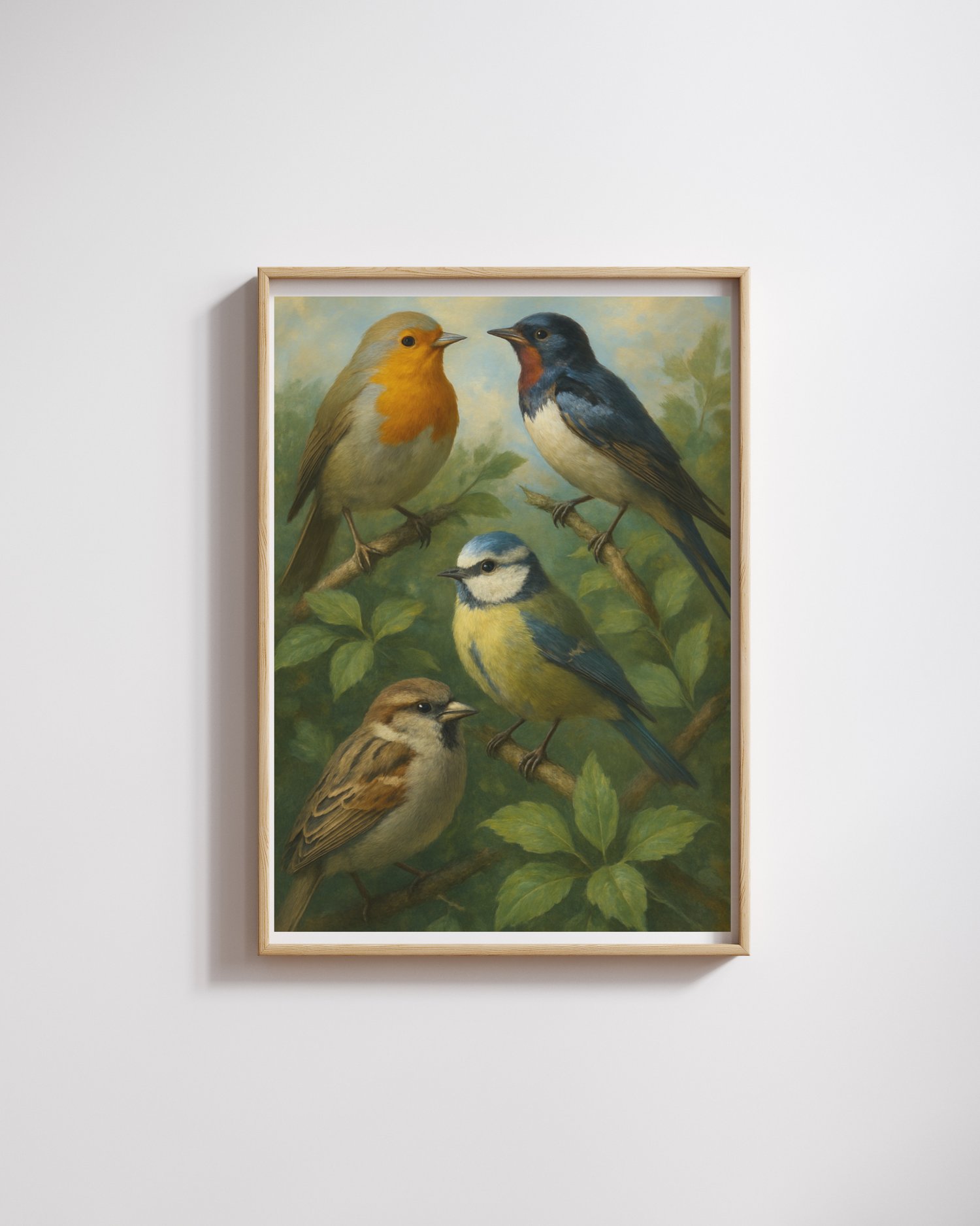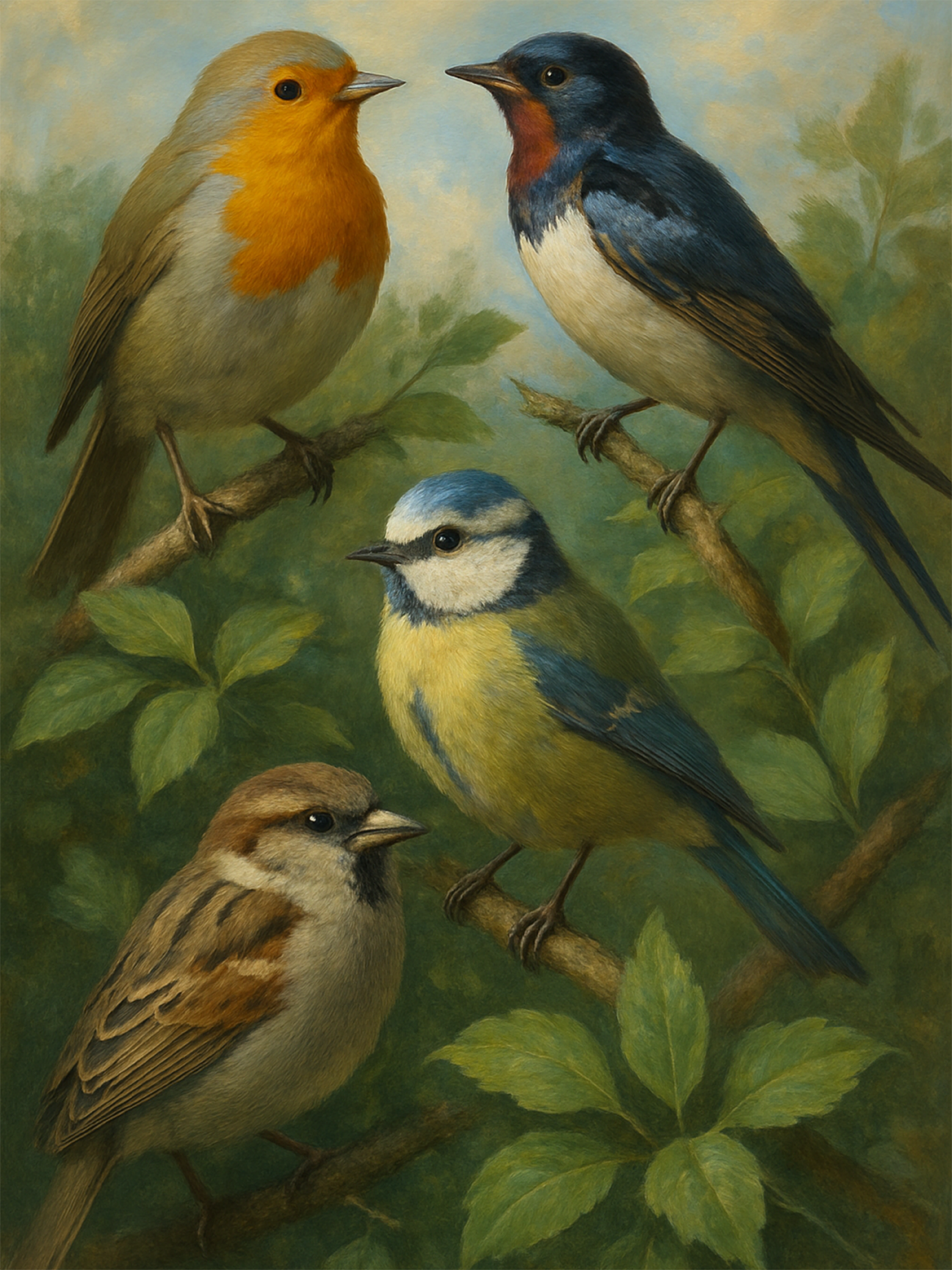 This captivating artwork presents a charming group portrait of four distinct songbirds, rendered in the rich, traditional texture of an oil painting. The composition features a European Robin, a Barn Swallow, a Blue Tit, and a House Sparrow perched naturally on leafy branches. The vibrant, individual colors of each bird from the robin's signature orange breast and the swallow's deep blues to the blue tit's striking yellow and blue cap are highlighted against a soft, blended background of earthy greens and misty sky tones. The visible brushstrokes and soft focus give the piece a timeless, classic feel, celebrating the quiet beauty and variety of natural life and gentle companionship found within a simple garden setting.