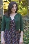 Wild Almond is a yoked cardigan construction that is knit back and forth seamlessly from the top down. This cardigan features a leaf motif at the yoke with integrated shaping. The silhouette is tailored with waist shaping to lend the drapey fabric a flattering shape. The sweater is intended to hit at the high hip, but length can be adjusted to your desired fit. The sleeves are bracelet length with a lace edging and slight blouson shape. A cropped option is also provided, designed to hit at the waist, with more fitted, ¾-length sleeves. After the sweater is completed sewn, mock-seams can be added to the under-arm and side seams to lend structure (if desired). Sleeves and neckline are finished with 2-stitch I-cord. After cardigan is completed stitches are picked up along the front opening and a double-knit stockinette band with integrated buttonholes is added (or an alternative picked up edge such as I-cord may be substituted).