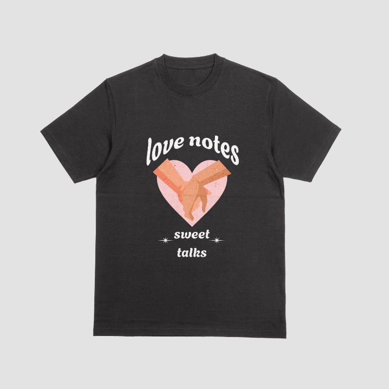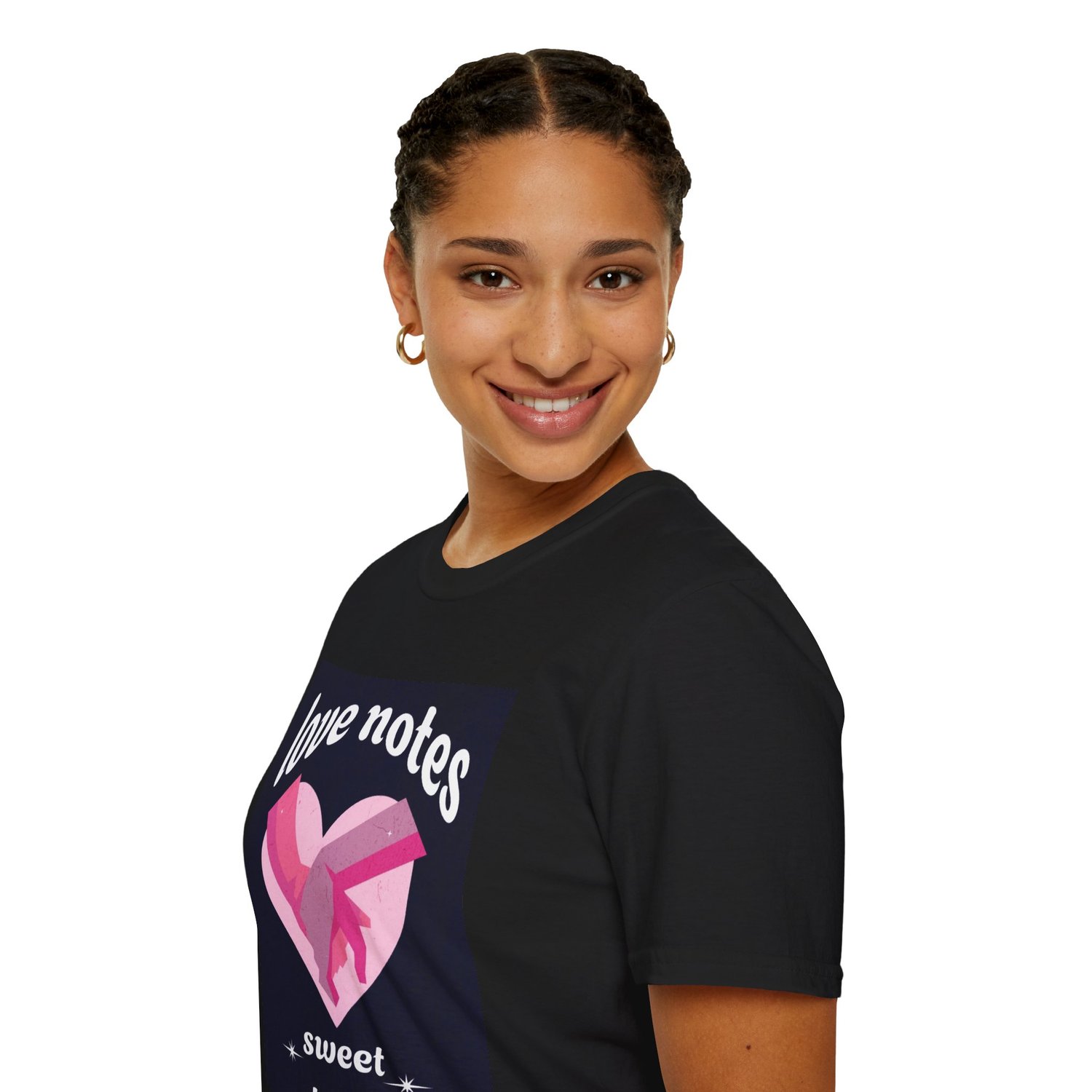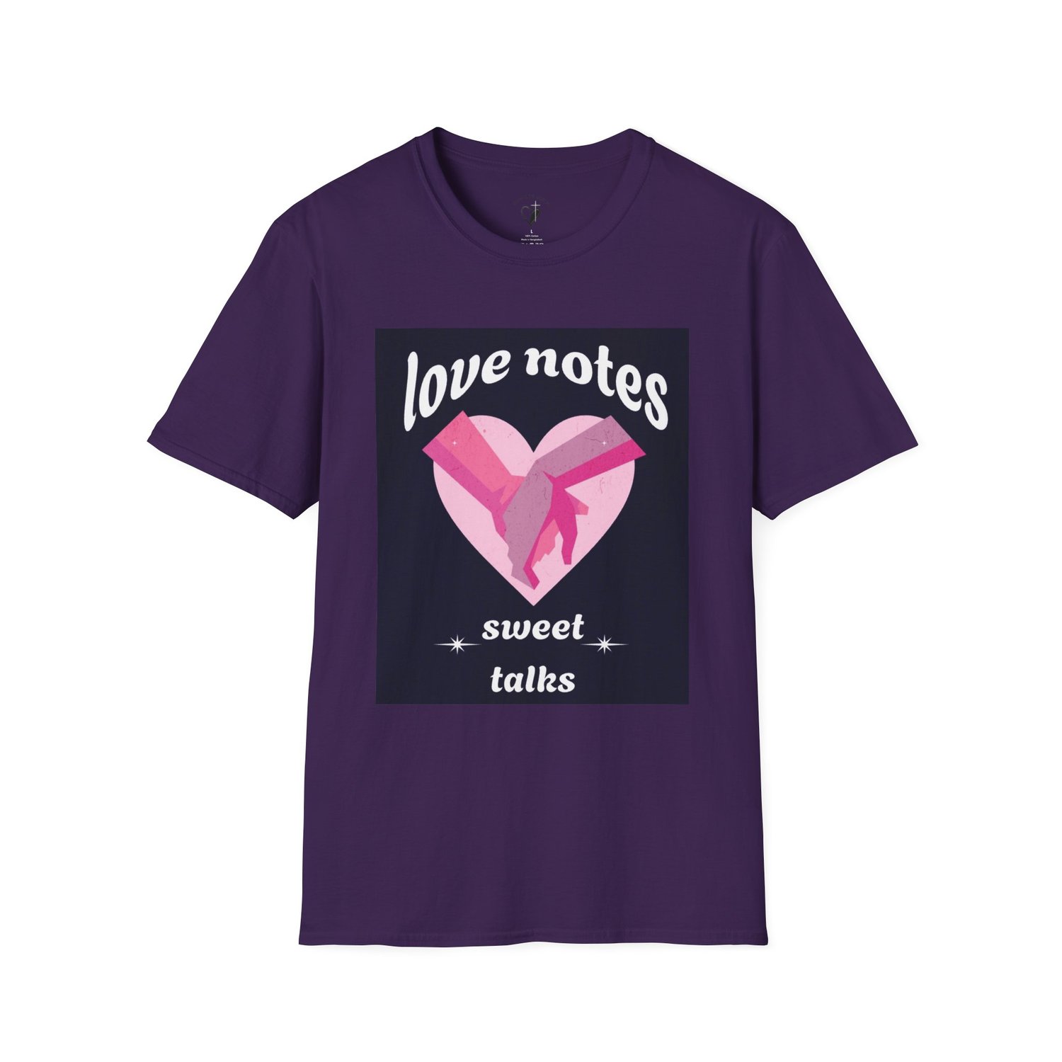 A women's tee with the quote 'love notes, sweet talks'. This softstyle T-shirt offers comfort and style with its classic fit and crew neckline, perfect for any occasion. Ideal for adults, this shirt is made with 100% ring-spun cotton for durability and smooth fabric that is perfect for printing. Relevant for casual wear, gifts for loved ones, Valentine's Day, birthdays, and special occasions.