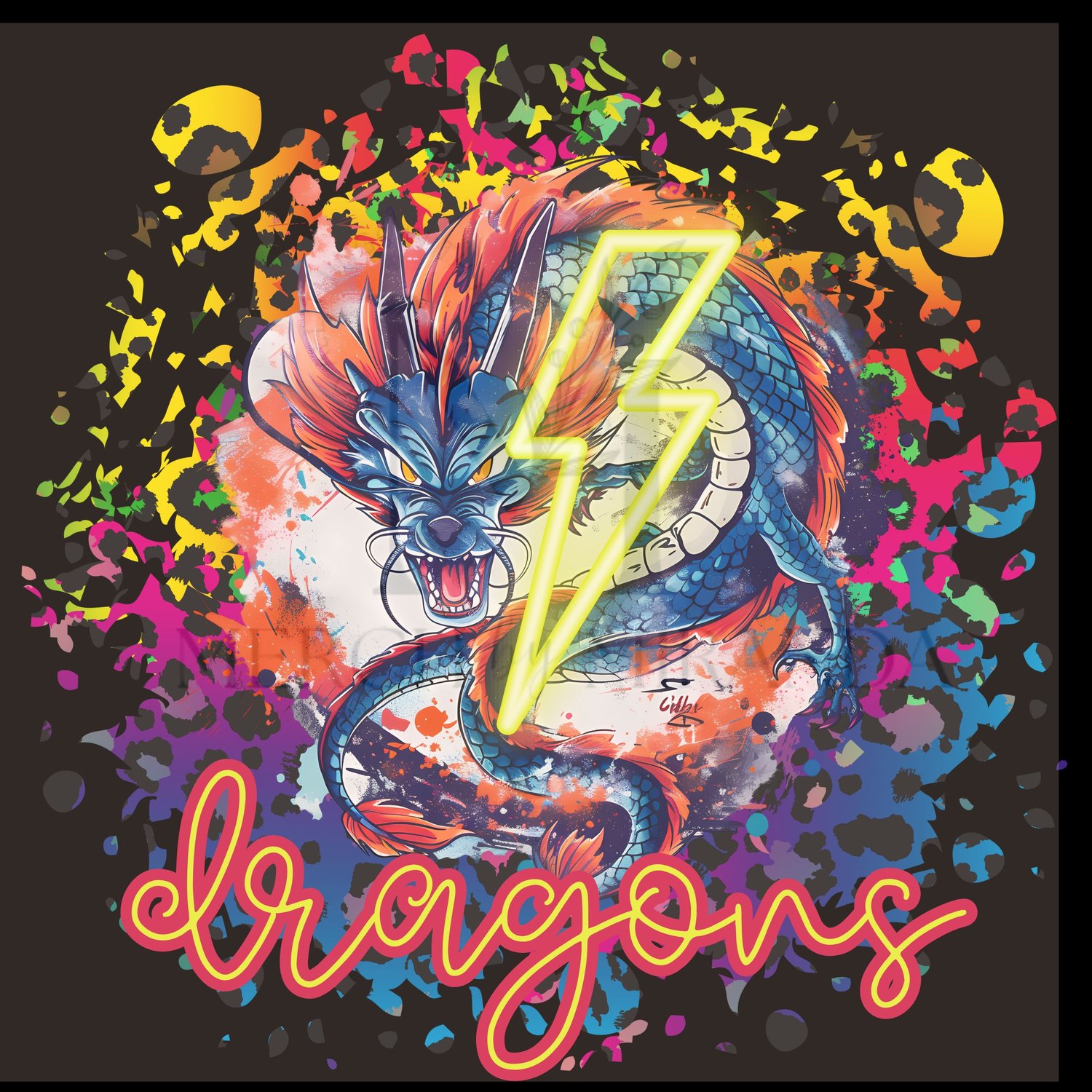 Dragon Mascot - Dragons - Neon Lightning Bolt - School Spirit - Digital Download - Leopard Print