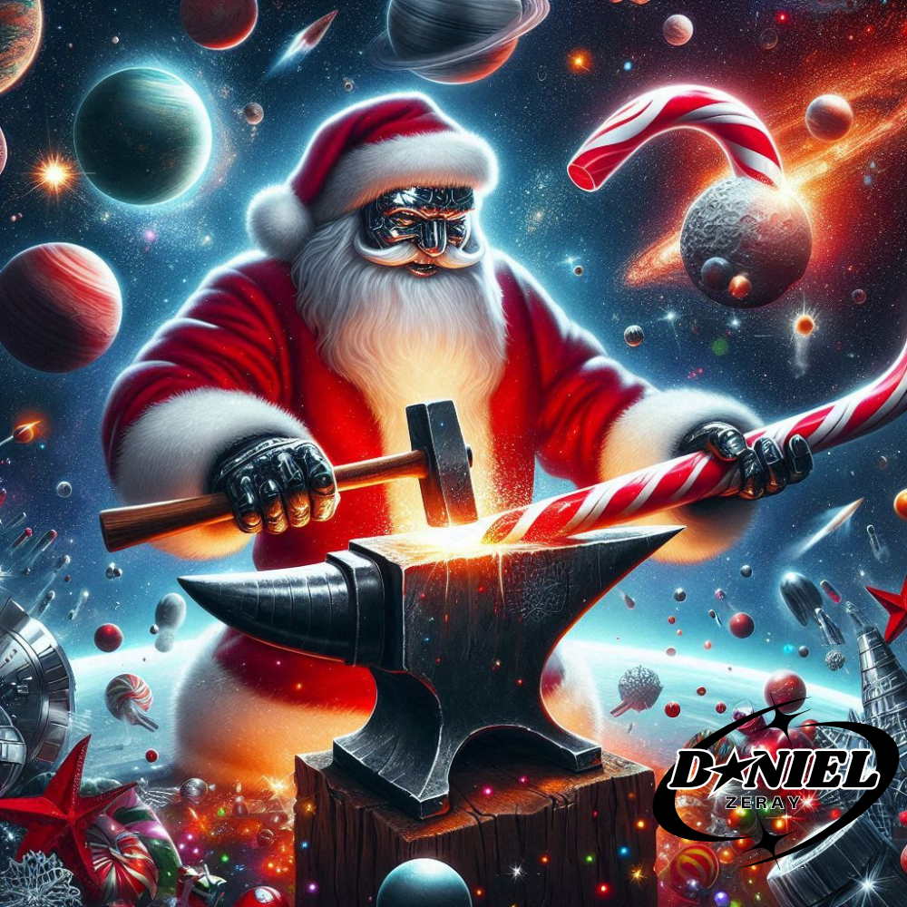 Immerse yourself in the breathtaking wonder of Santa’s Cosmic Frost Forge, a masterpiece that reimagines the magic of Christmas on a galactic scale. This stunning artwork brings to life a dazzling scene set atop a massive icy comet hurtling through the vast expanse of space. The forge, a monumental crystalline structure glowing with hues of blue, white, and silver, pulses with the vibrant energy of the cosmos, serving as the heart of Santa’s gift-making magic.