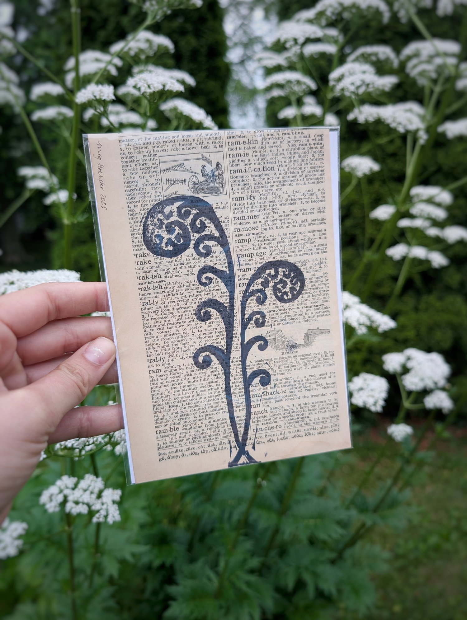 5x7 inch hand illustrated linocut print on vintage illustrated dictionary pages, featuring one of my favorites- the fiddlehead fern. These pieces are truly one of a kind- due to the nature of book pages and the nature of linocut prints, each print is going to look a bit different and feature slightly different book page illustrations.