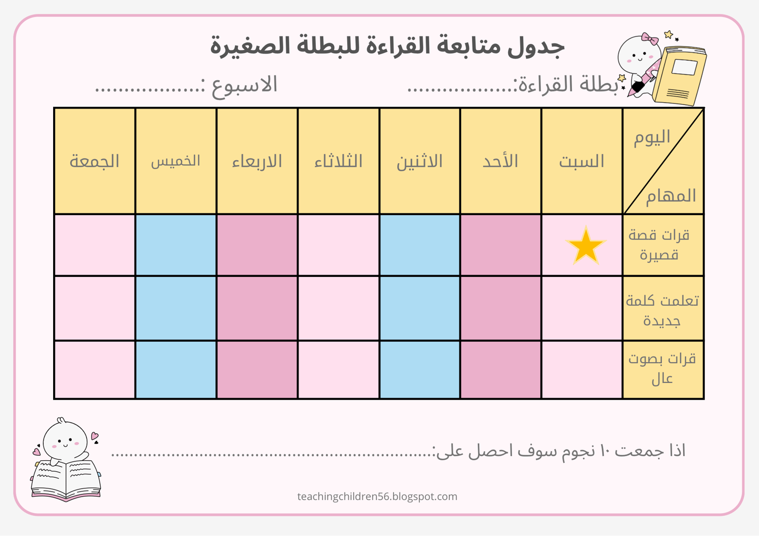 • ✅ جدول متابعة القراءة اليومي: مصمم بألوان مبهجة لتعزيز عادة القراءة وتتبع الكلمات الجديدة التي يتعلمها طفلك كل يوم.