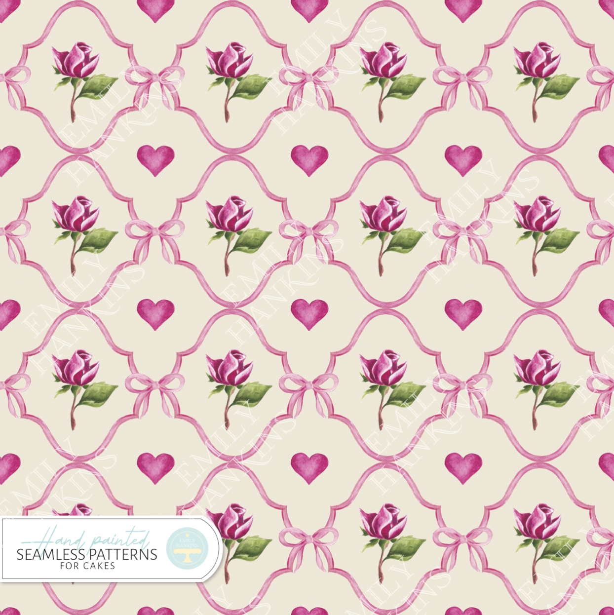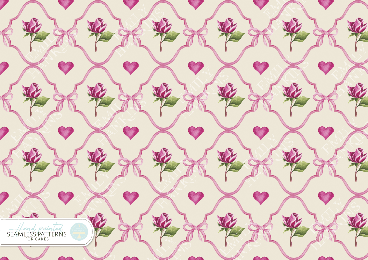 The design is inspired by romance - something we all need a little bit of in our lives! It features rose buds and hearts within a trellis design on a cream background. Each flower and design element has been hand painted by Emily and painstakingly crafted into a seamless pattern for your cake designs.