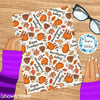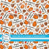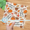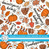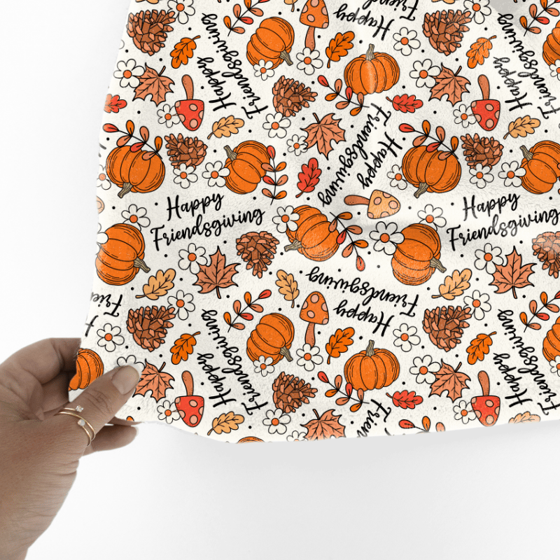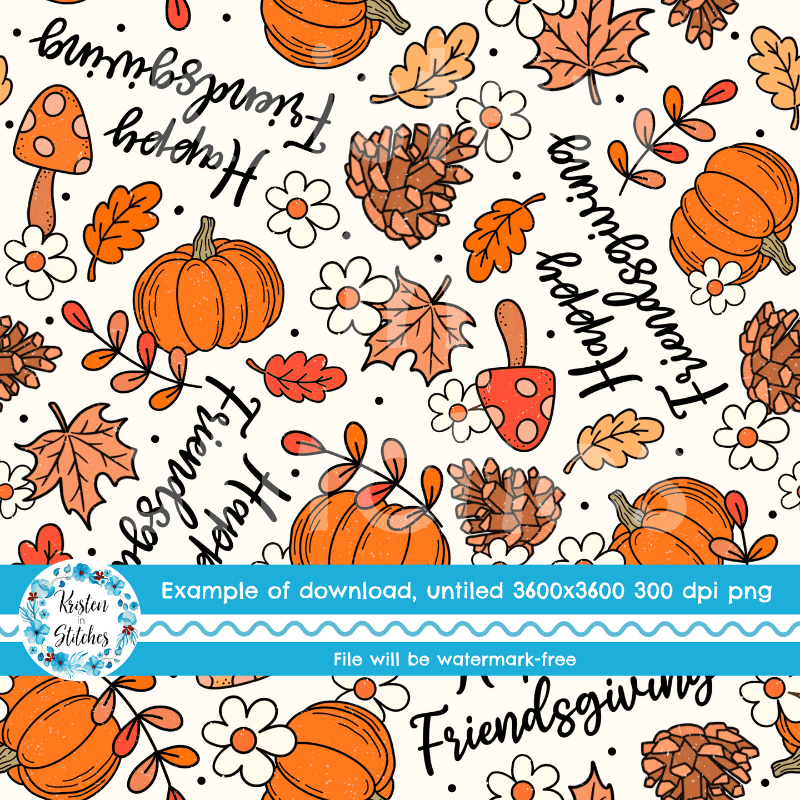 Happy Friendsgiving pattern with pumpkins, mushrooms, pine cones, leaves and daisy flowers.