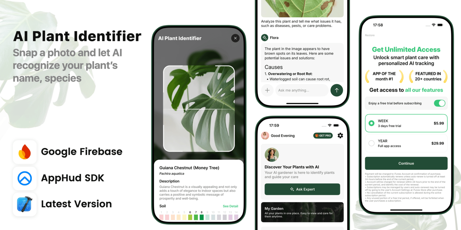 AI Plant Identifier is a fully featured, production-ready app ideal for the booming gardening, sustainability, and education markets.