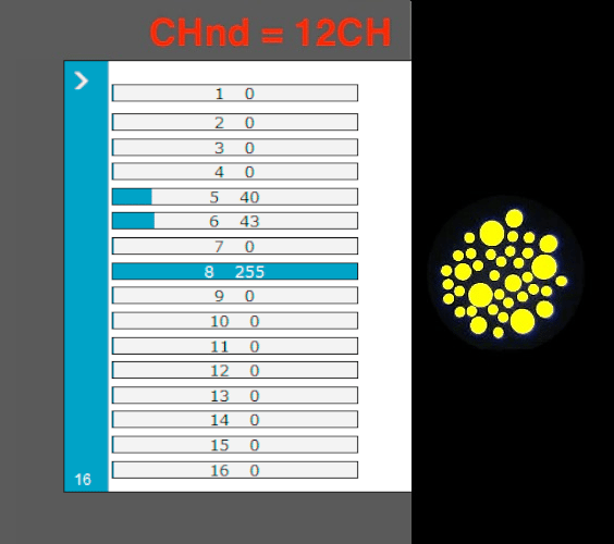 * En el modo de 12CH Verifique, con un Fixture de pruebas (click), que coincidan estos canales: 8 Dimmer, 5 en el valor 40 = Color Amarillo, 6 en el valor 43 = Gobo de la cuarta foto.