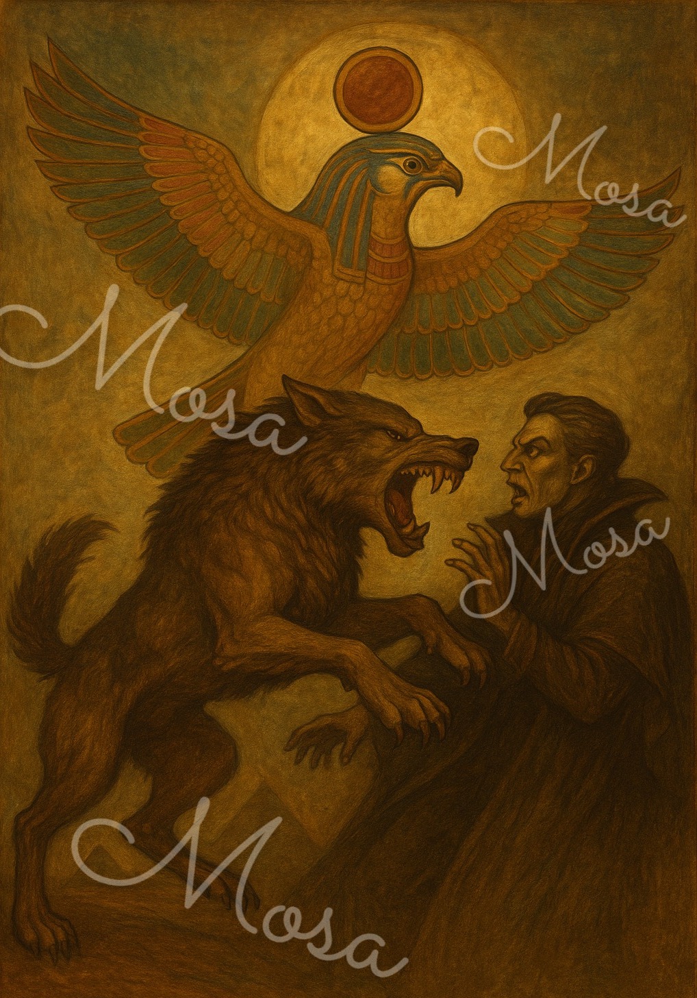 This is not just a fight -it’s a message. The wolf stands tall, fierce yet pure, facing the bat that hides in filth and shadow. Horus does not descend to strike; beings of light do not wrestle with the unworthy. But the wolf carries that light-sharp, silent, and uncompromising. This piece captures a forgotten law: true power walks above the dirt, not through it.