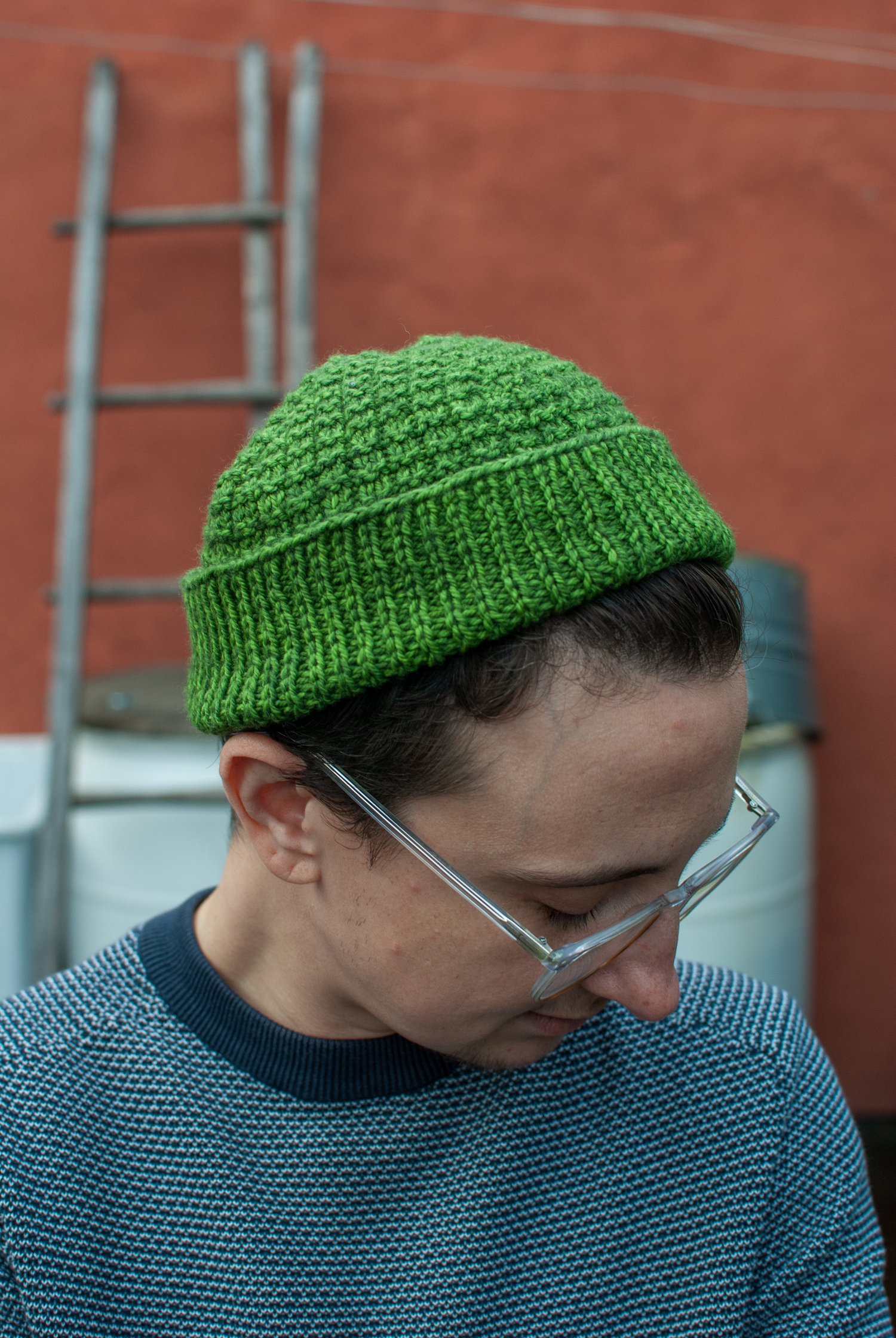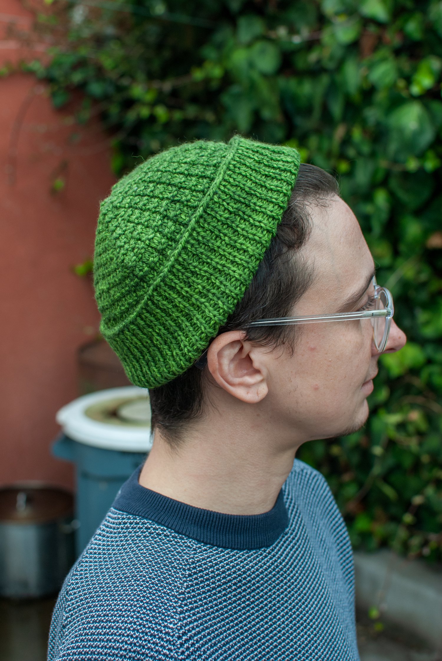 This one skein wonder is a short fisherman’s beanie with a folded brim and a great textured stitch on the body of the hat. Even though the beanie is small, there are several design elements in the construction of the beanie that makes the appearance look polished.
