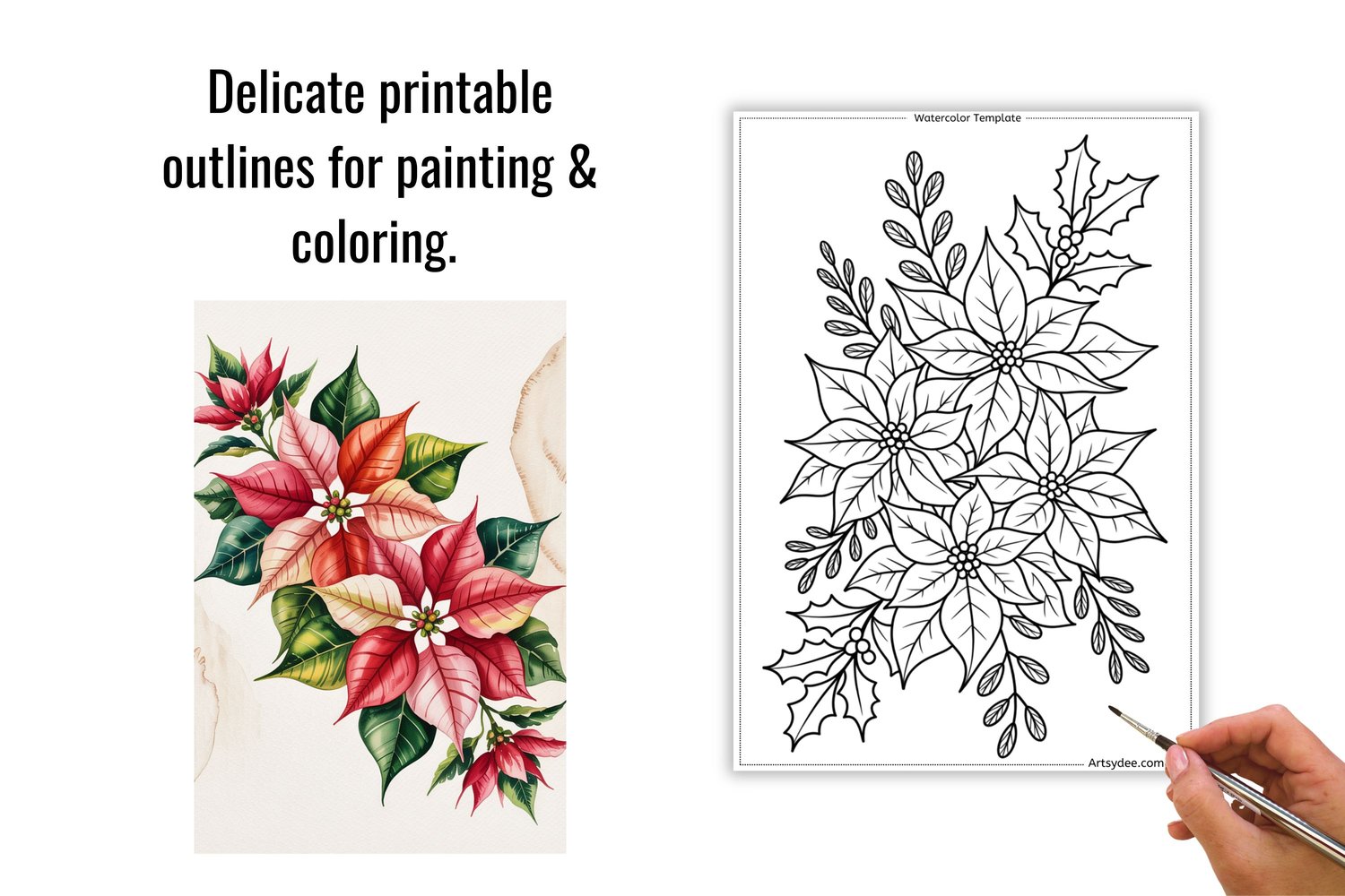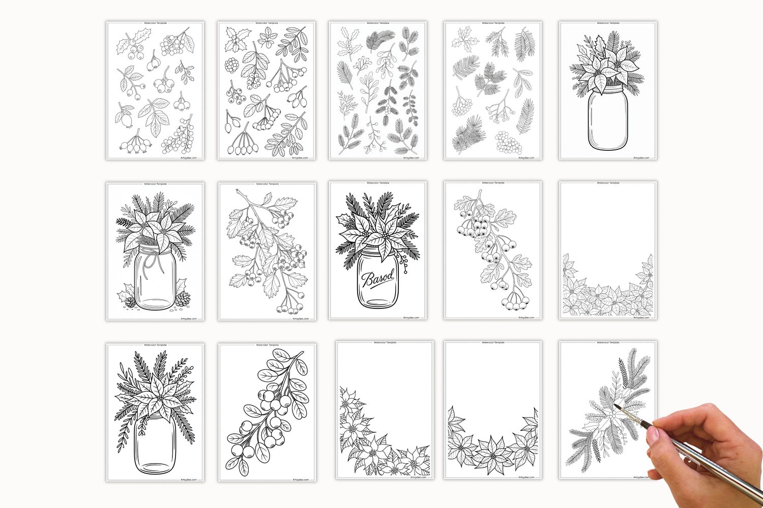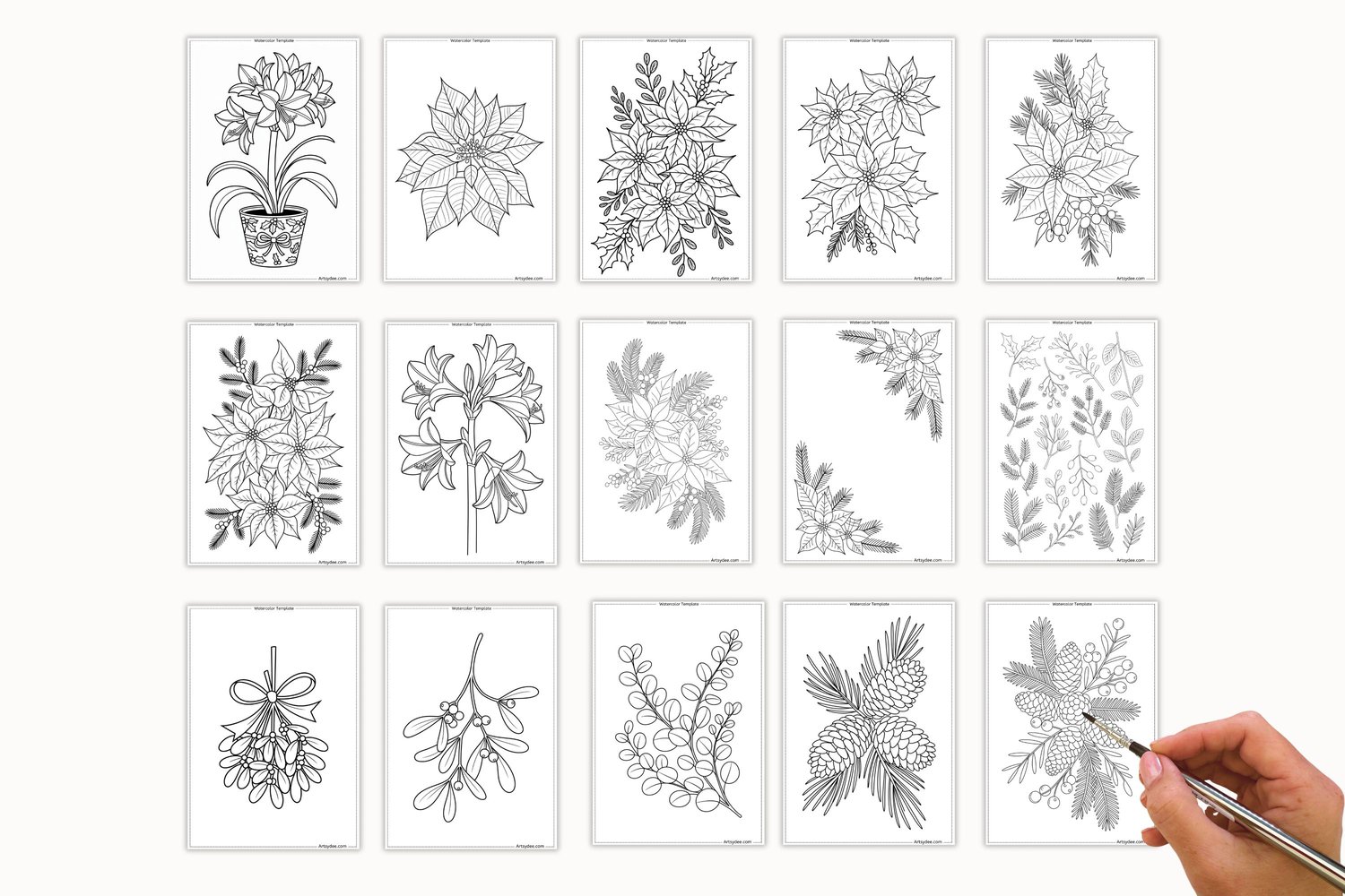 Christmas Florals & Botanicals — 50 Watercolor Templates & Digi Stamps | Poinsettia, Holly, Pinecones & Winter Blooms | Printable Painting Outlines