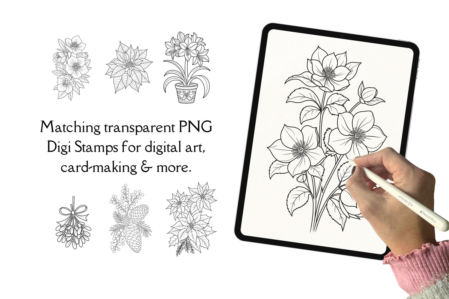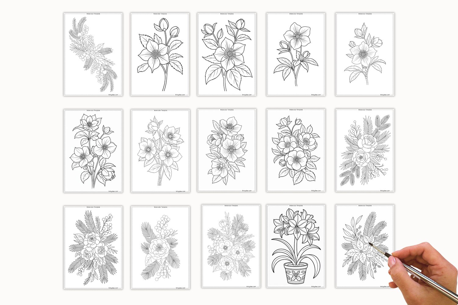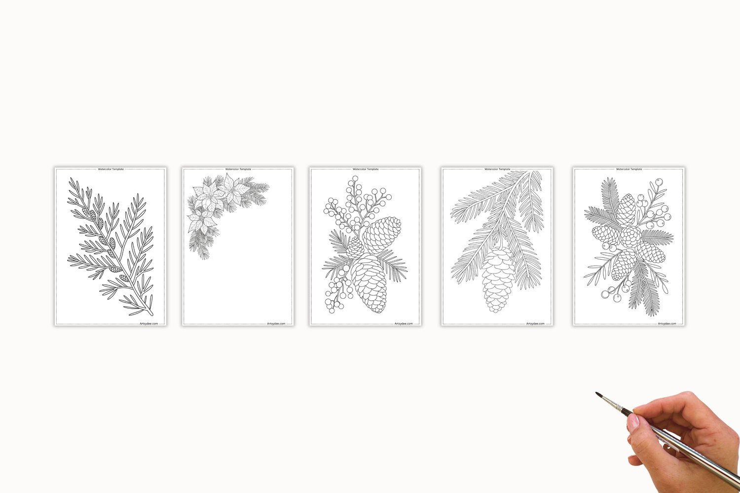 Christmas Florals & Botanicals — 50 Watercolor Templates & Digi Stamps | Poinsettia, Holly, Pinecones & Winter Blooms | Printable Painting Outlines