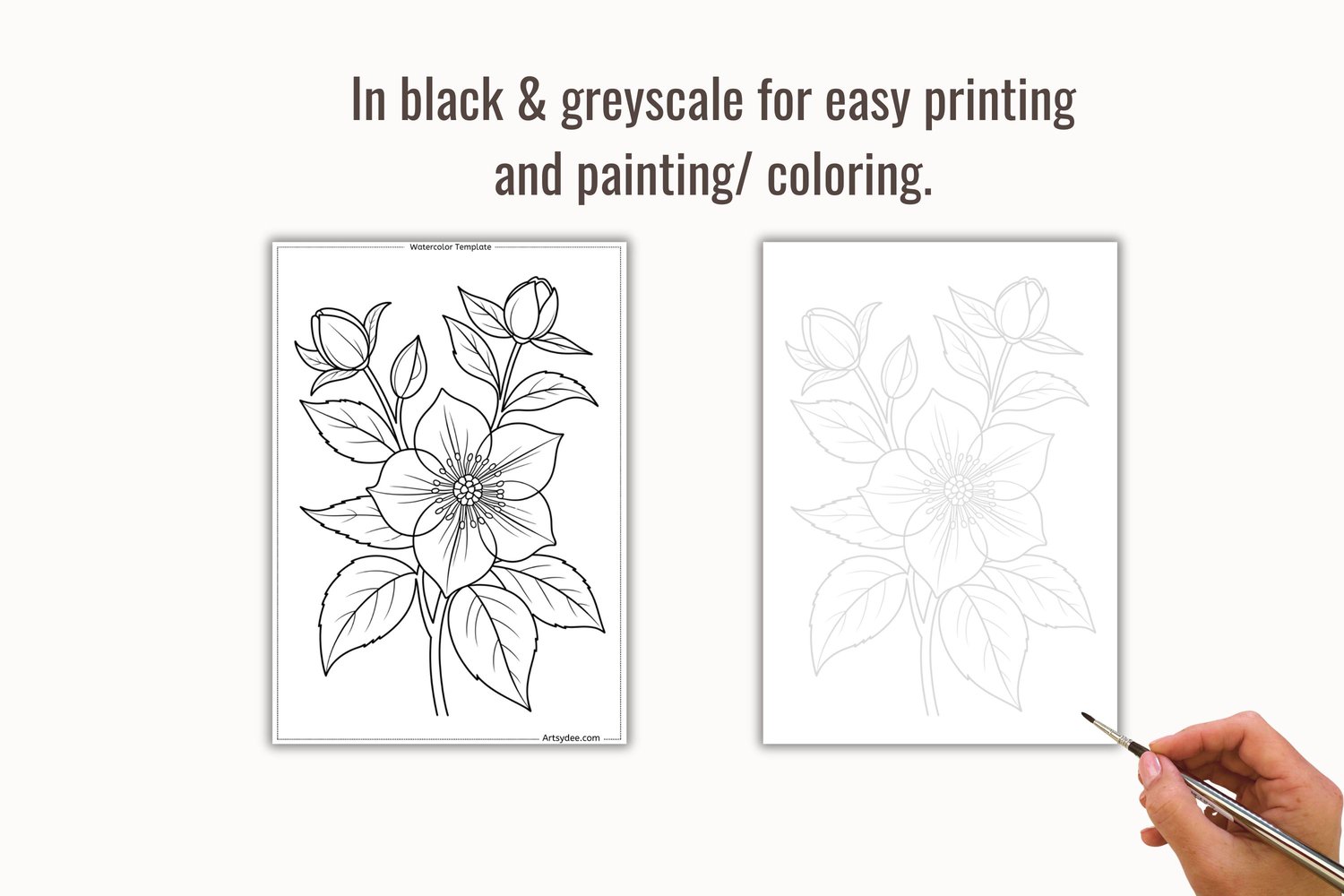 The greyscale versions are perfect when you want softer lines that disappear under your paint. The black versions work beautifully for bold outlines or colouring.