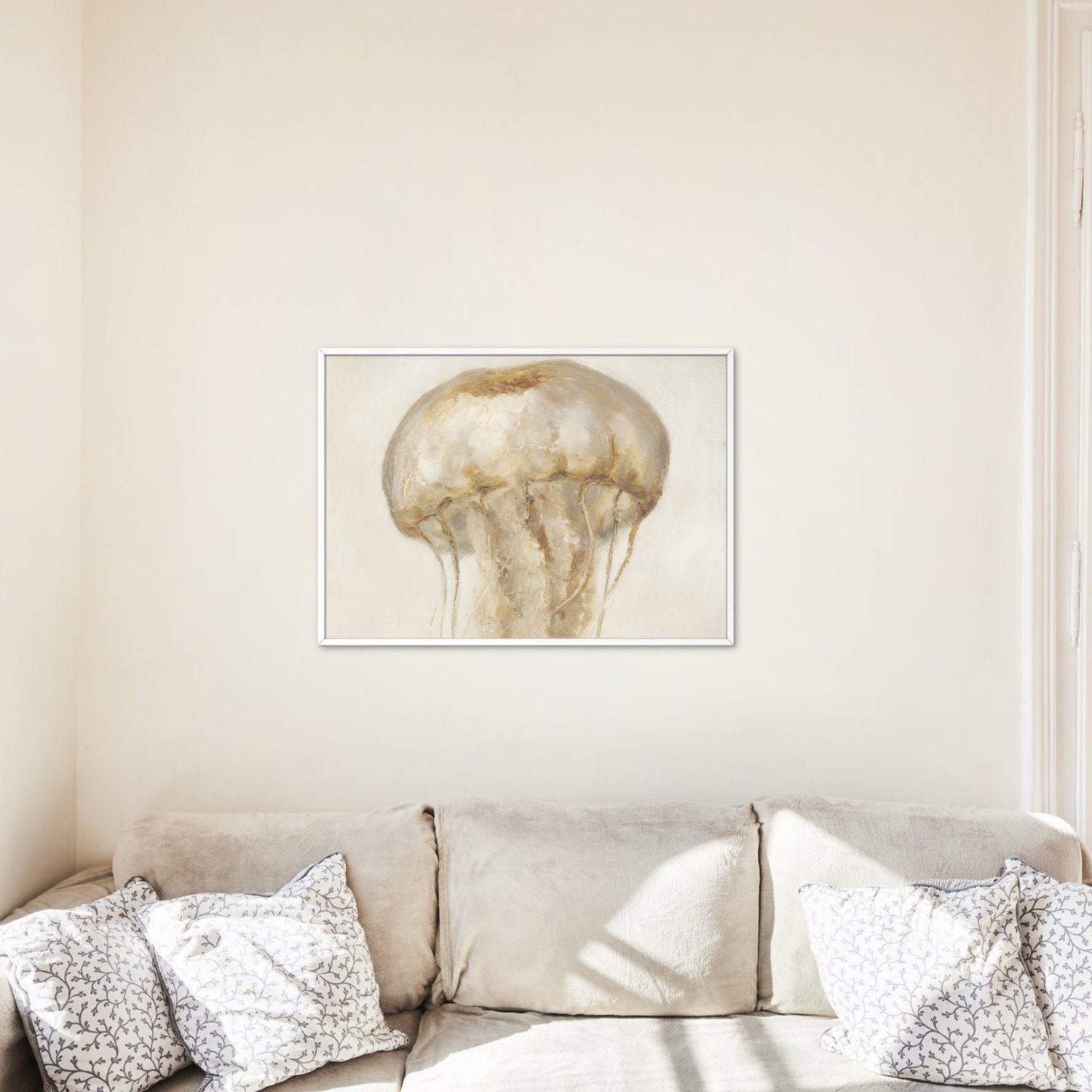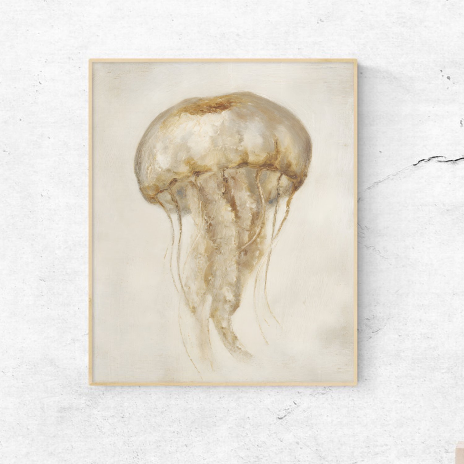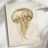 Discover this delicately watercolor-painted jellyfish, floating gracefully in soft, natural tones. Its warm shades of beige, sand, and brown create a soothing, elegant, and minimalist atmosphere.