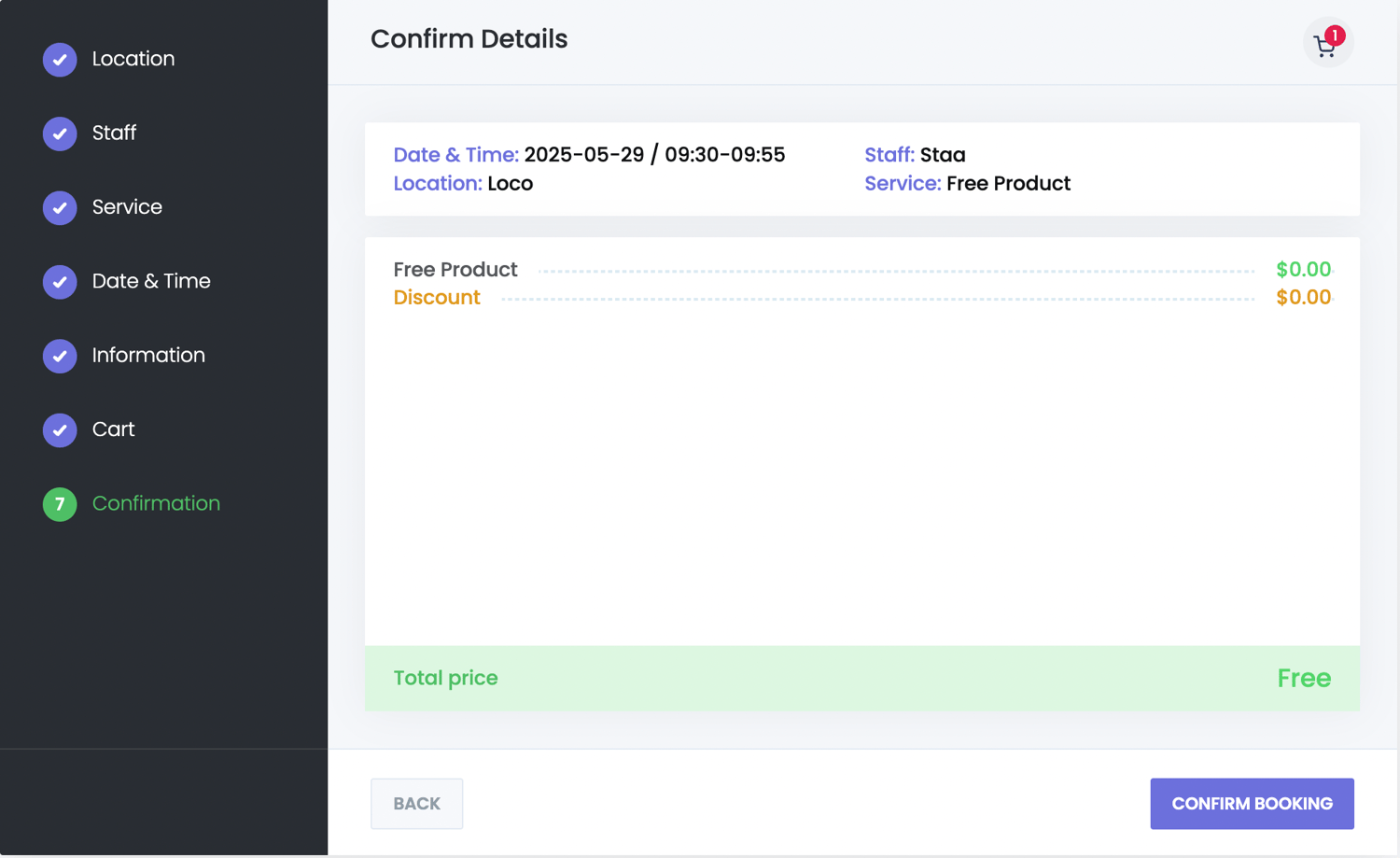 Replaces zero-priced service labels with ‘Free’ on the booking panel for a cleaner and more user-friendly experience.
