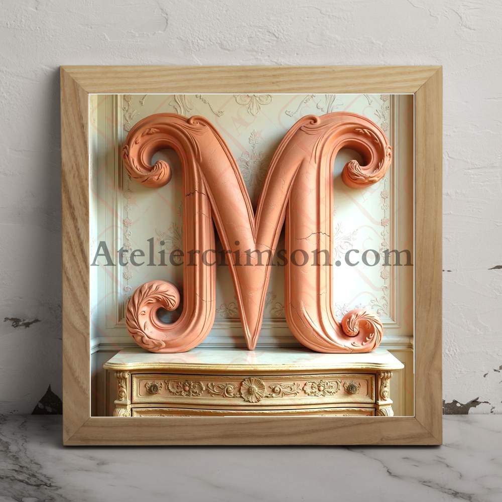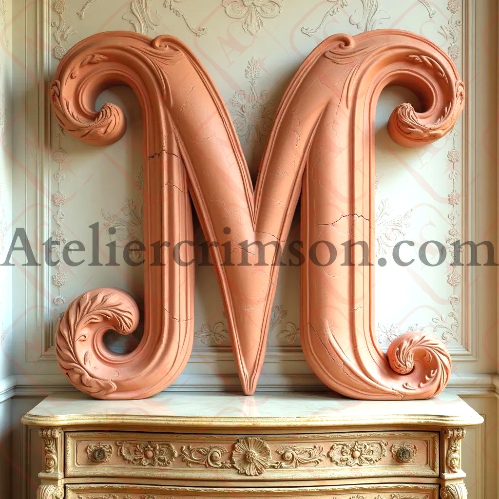 The letter M terracotta Art Nouveau typeface inspired by Alphonse Mucha's with flowing lines and floral motifs, set against a soft, muted background with a gilded wooden dresser and subtle lighting effects.