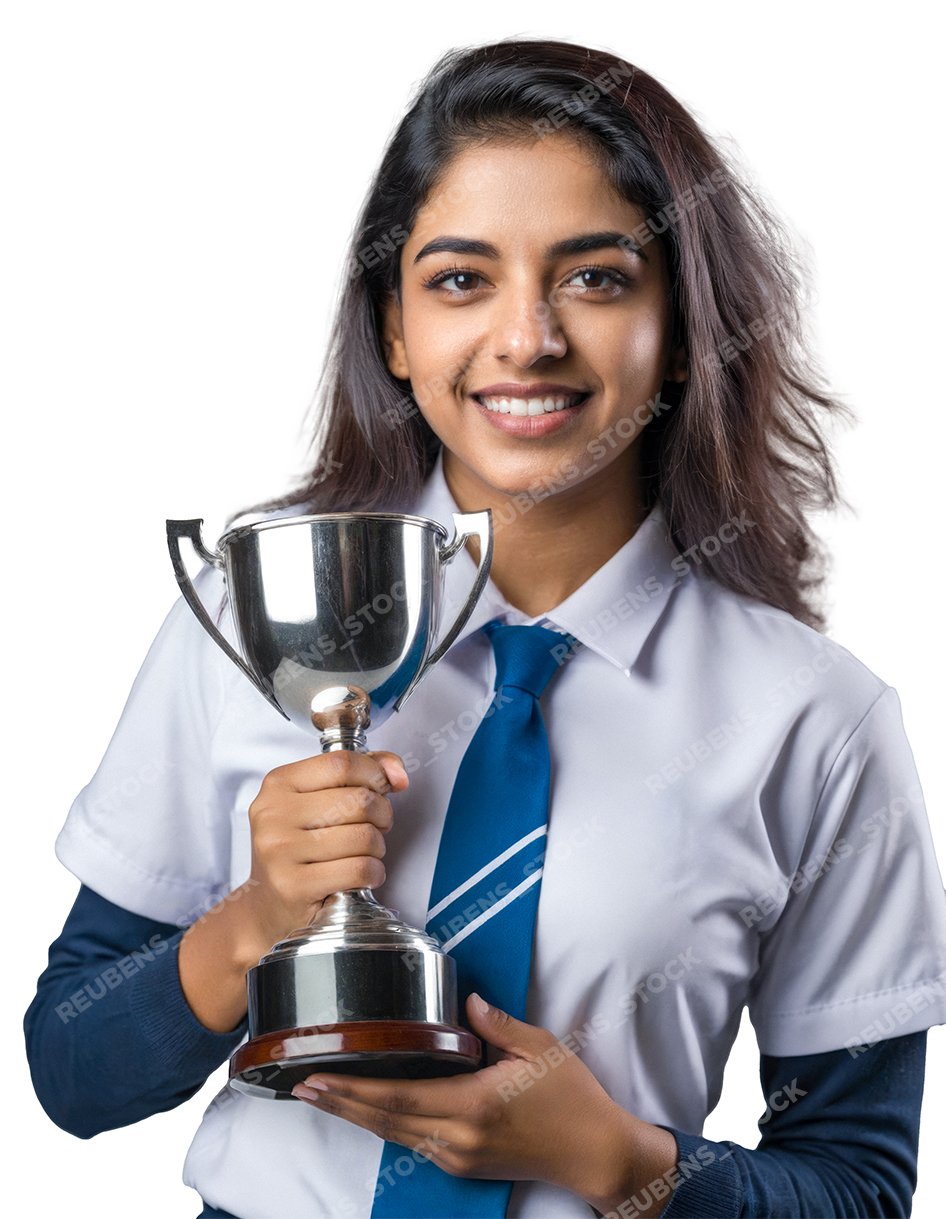 Young Indian Female Student in School Uniform Holding a Winner’s Trophy Against White Background
