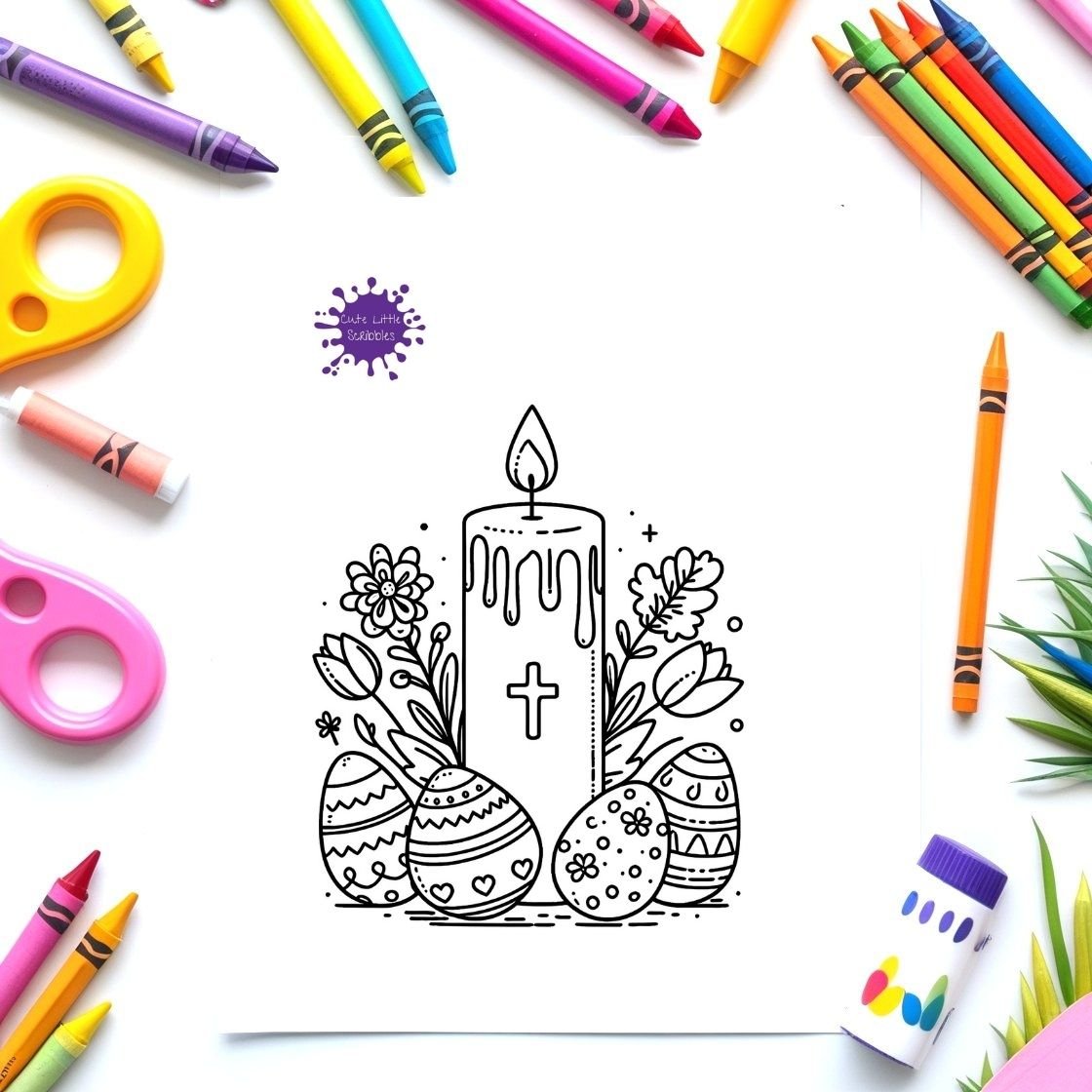 This joyful coloring page features a tall Easter candle with a soft flame, surrounded by beautifully decorated eggs and springtime tulips and daisies. With heartwarming symbols and kid-friendly shapes, it’s perfect for Easter crafts, Sunday school, or family fun.