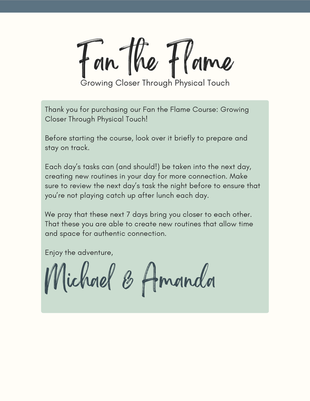 Fan the Flame is a 7-day challenge designed to help couples grow closer through intentional, meaningful physical connection. Whether you're looking to reignite the spark or simply create space for more closeness, this faith-centered guide offers daily encouragement and gentle challenges to help you reconnect.