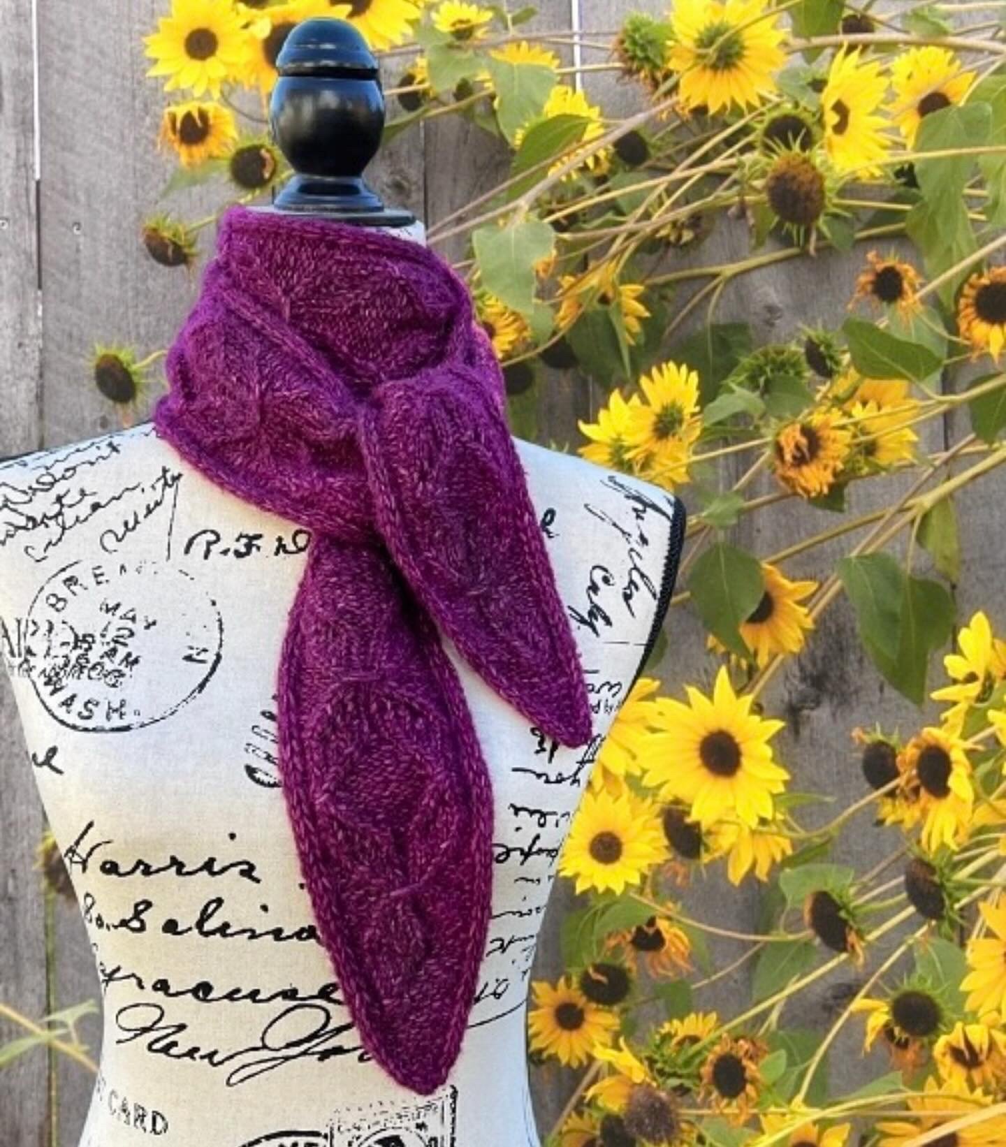 This sweet scarf uses a modified dragonfly-lace pattern with zero-cabling (a smocked set of sts repaces the cables) and a neat, icord edging.