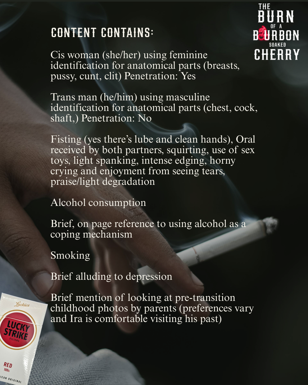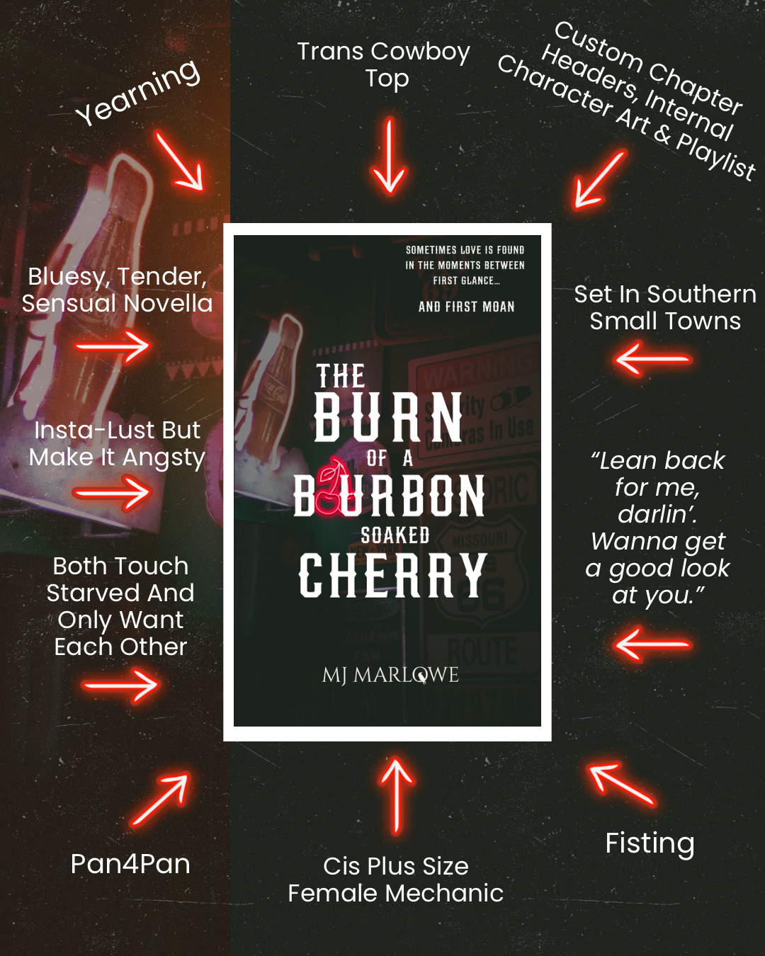 🍒THE BURN OF A BOURBON SOAKED CHERRY is a 18+ queer, small town, age gap romance between a Trans M/Cis F, packed with high heat and a tender touch to soothe the burn