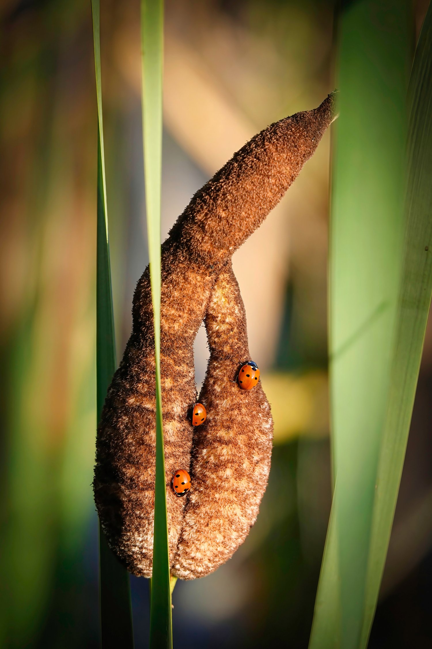 Three ladybirds (Coccinella septempunctata) on the broad leaf cattail. They still enjoy the last warm days of September.