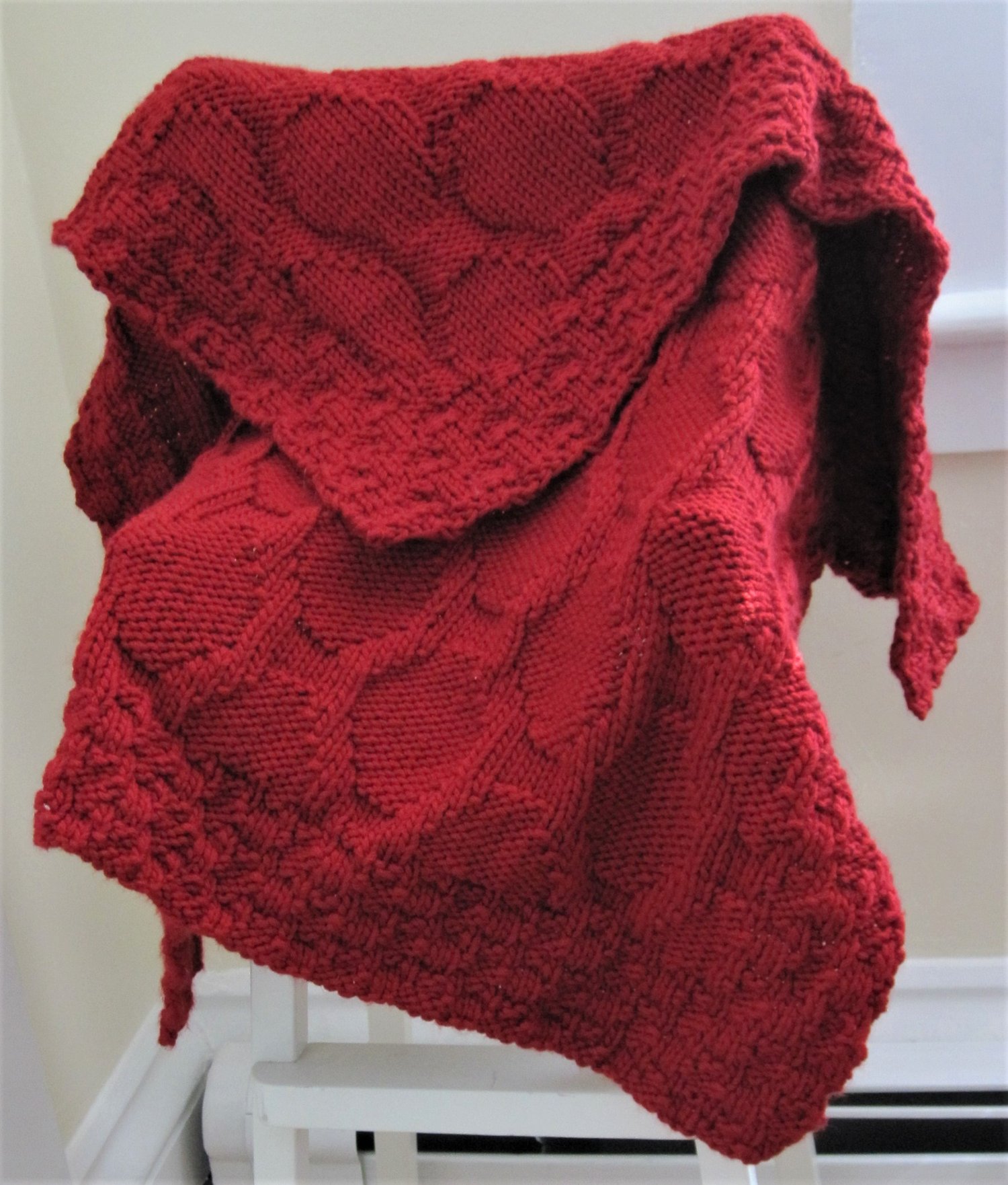 The octagonal motif on one side becomes a trellis pattern on the other; this large scale image is repeated in a somewhat surprising way in miniature for the border. This blanket may look complex, but the repeats are simple and predictable; a fun knit and a fit treasure for the new royalty in your family.