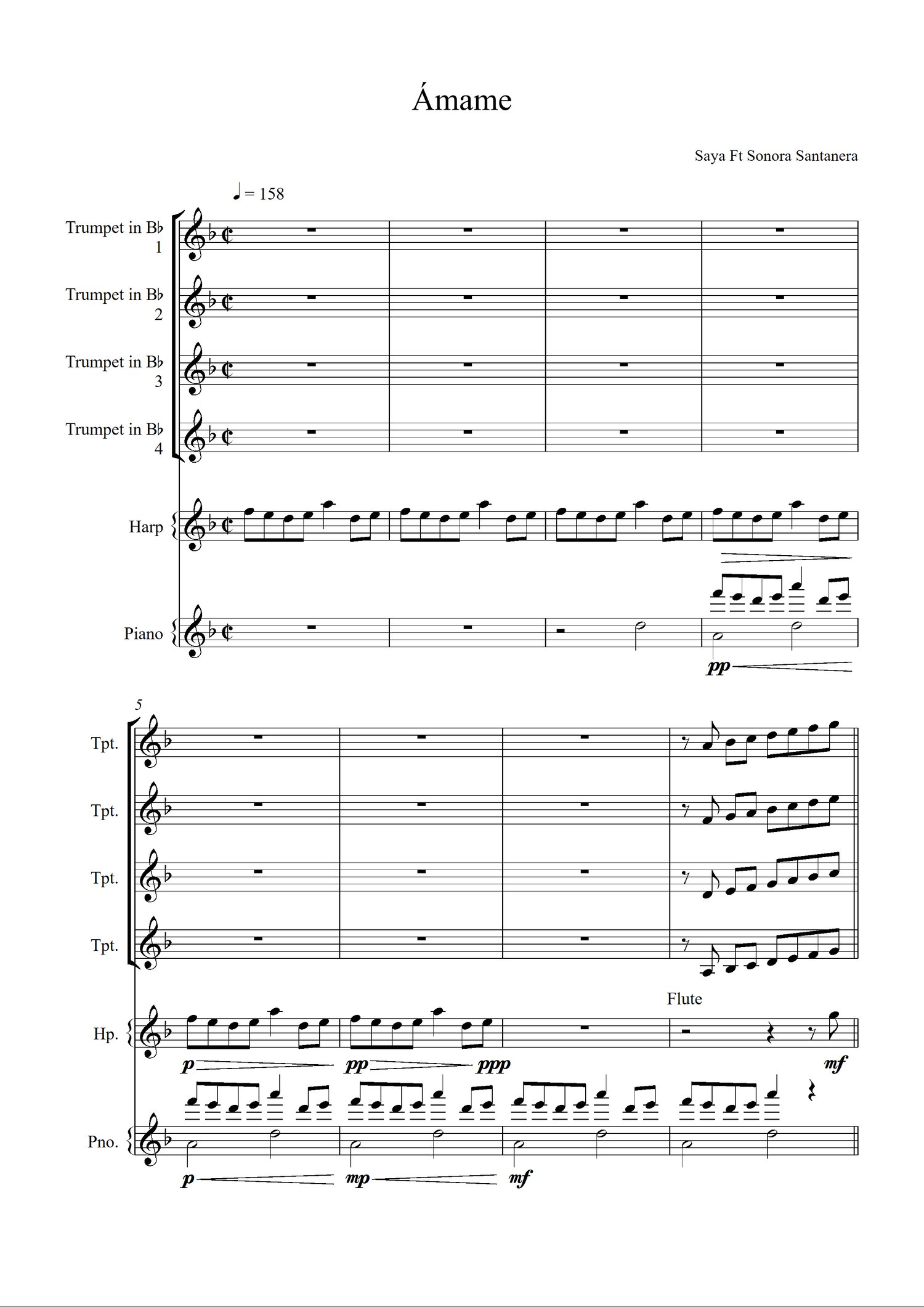 Partitura de la canción (Ámame - saya Ft, Sonora Santanera) Para Trompeta 1, 2, 3, 4, Piano, Bajo (Acústico), Arpa (Flauta)