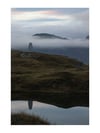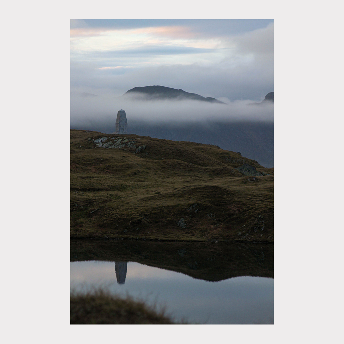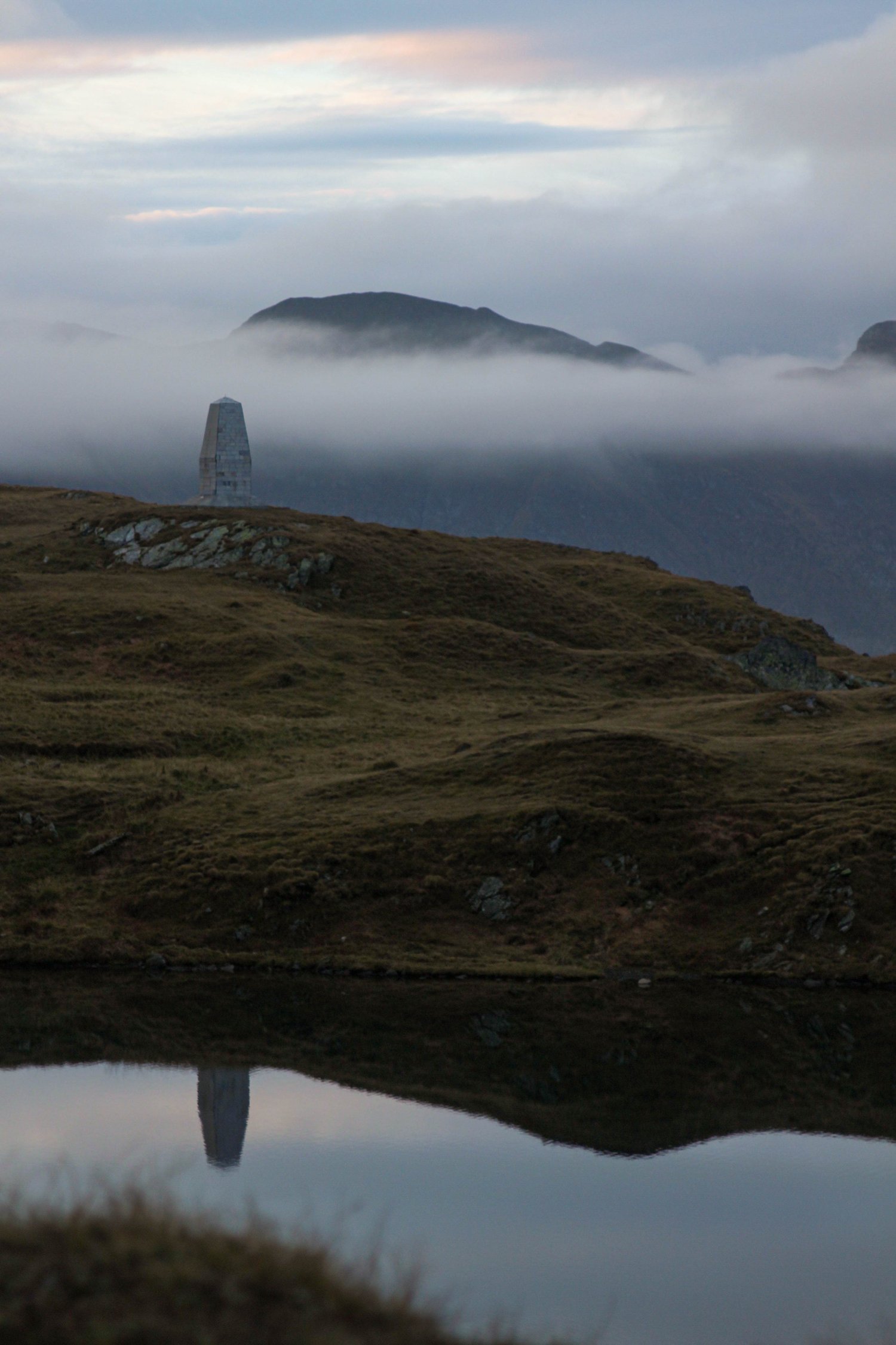 Face à moi, un lac parfaitement immobile reflétait le ciel comme un miroir. Juste au-dessus, une bande de terre verdoyante accueillait un obélisque blanc, posé là comme un repère mystérieux. Plus loin, les montagnes se découpaient dans la lumière naissante, donnant à la scène une profondeur presque irréelle. Et tout en haut, le ciel répondait au reflet du lac, au point qu’on pouvait presque confondre les deux.