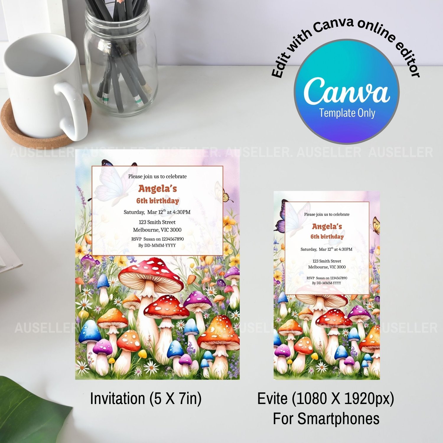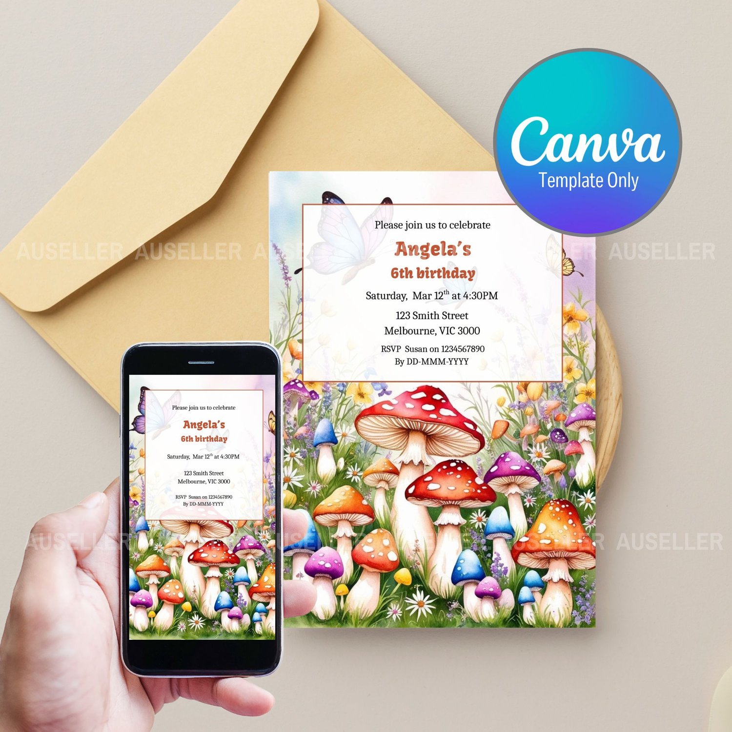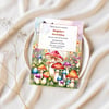 Bring a touch of magic to your child’s special day with this enchanting magic mushroom-themed birthday invitation! Featuring a vibrant forest scene filled with colourful mushrooms, butterflies, and wildflowers, this design sets the perfect tone for a whimsical celebration. The playful yet elegant layout makes it easy to personalise with your child’s name, age, party details, and RSVP information. This whimsical invitation is perfect for nature lovers and little ones who adore fairytale adventures.