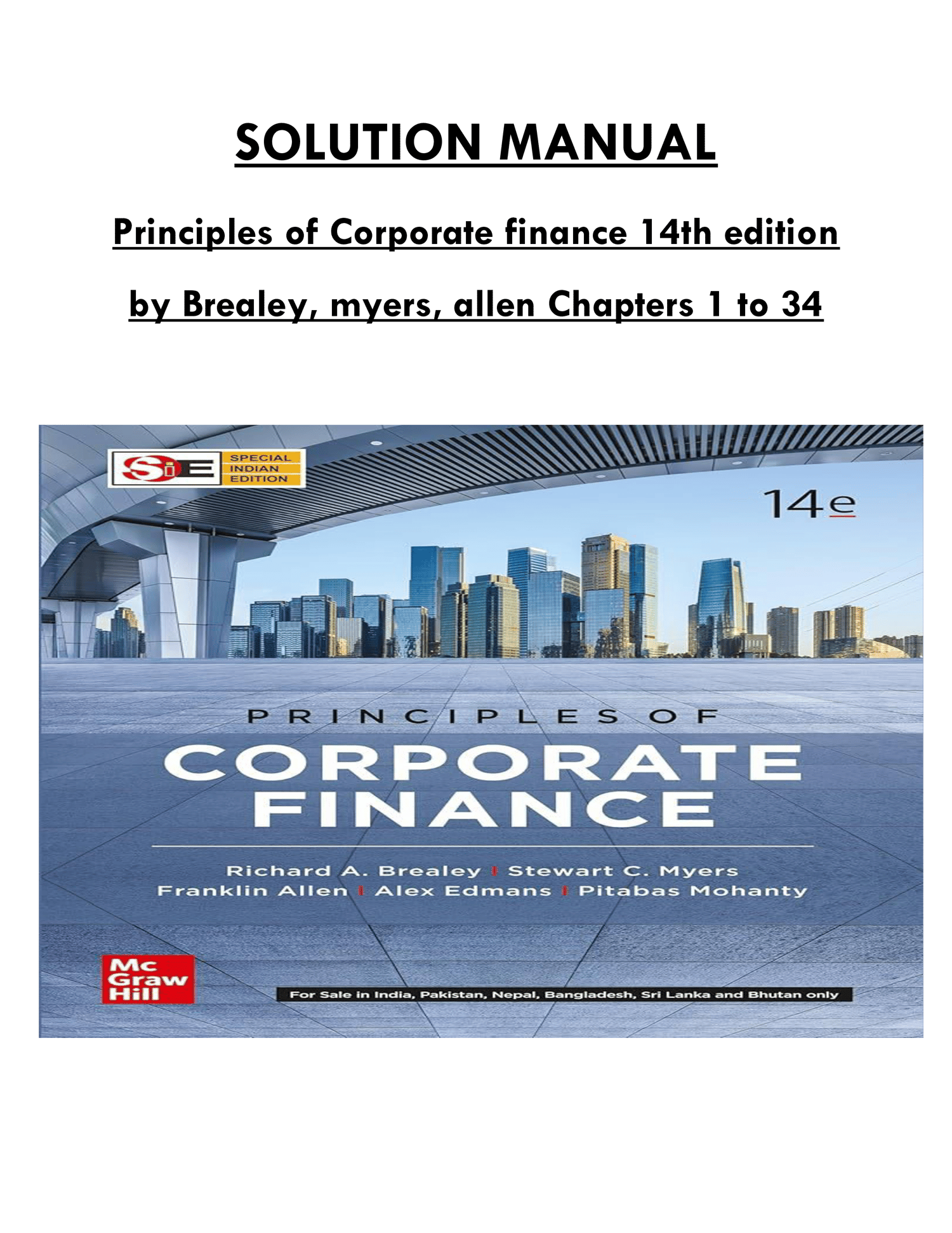Master corporate finance with the Solution Manual for Principles of Corporate Finance, 14th Edition by Brealey, Myers, and Allen. This complete guide provides step-by-step solutions to all problems and exercises from Chapters 1–34, making it the perfect companion for students, instructors, and professionals.